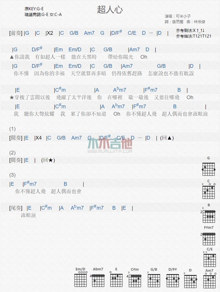 曲谱介绍: 超人心《超人心_》吉他弹唱谱,共有1张高清图谱,免翻页排版设计。