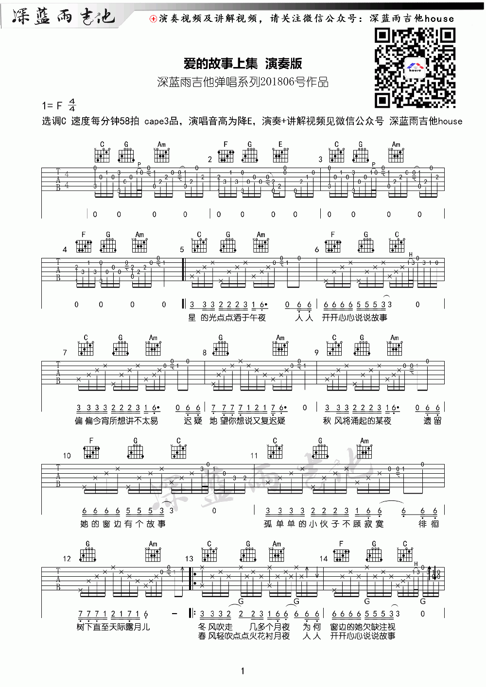 爱的故事上集_F调吉他谱 - 爱的故事上集 - F调吉他弹唱谱
