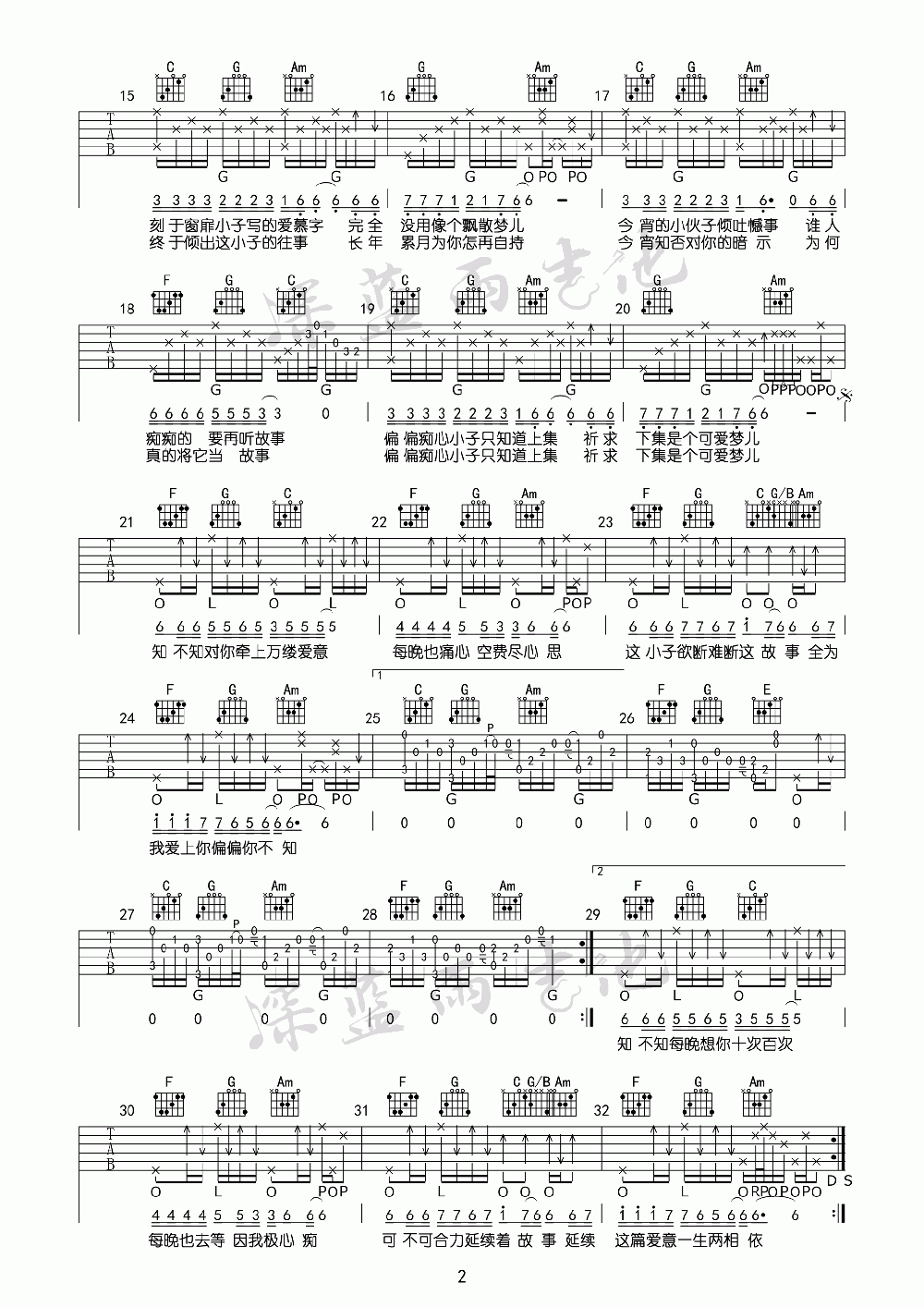 曲谱介绍: 爱的故事上集《爱的故事上集_F调》吉他弹唱谱,采用F调指法编配,共有2张高清图谱,免翻页排版设计。