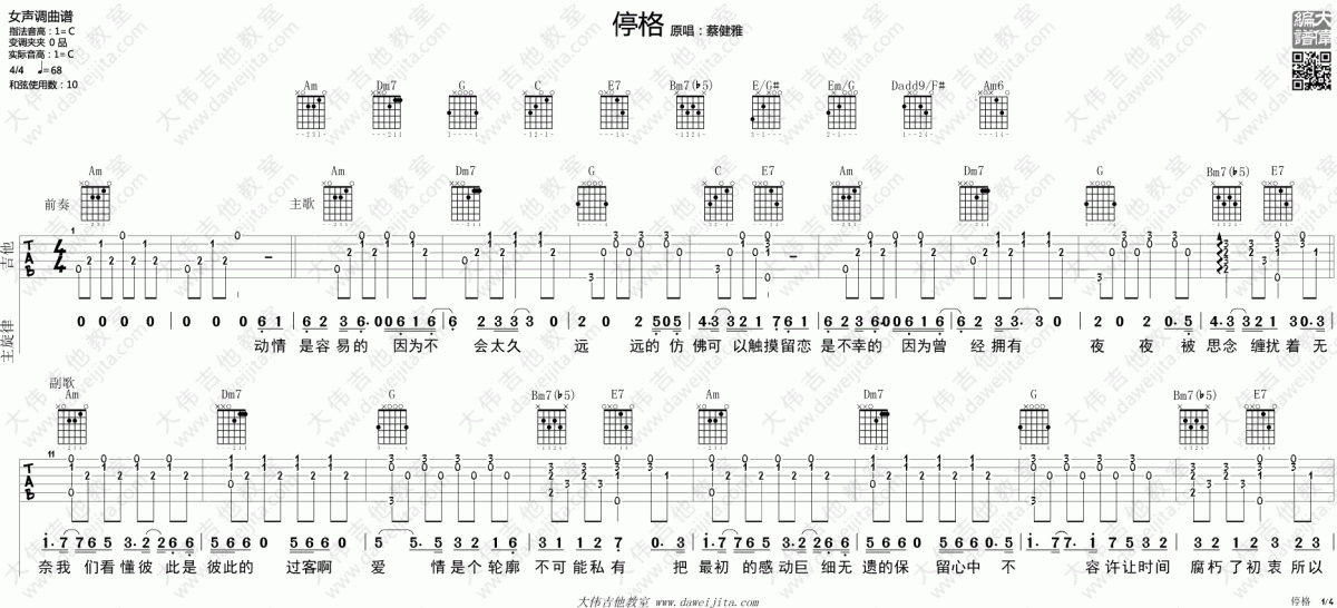曲谱介绍: 停格《停格_C调》吉他弹唱谱,采用C调指法编配,共有3张高清图谱。