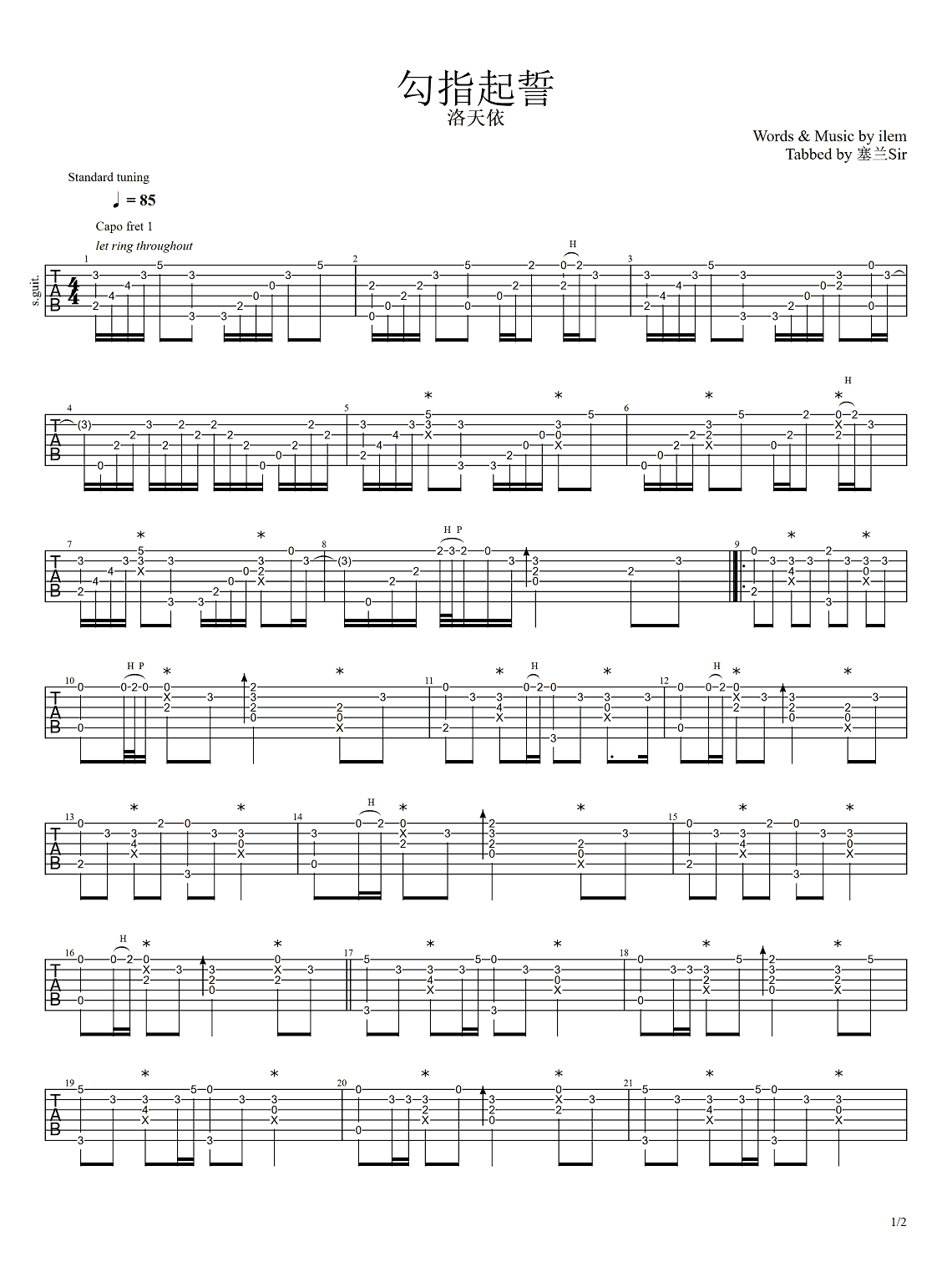 曲谱介绍: 本曲谱是洛天依演唱歌曲《勾指起誓》吉他指弹谱,共两张PNG图片六线谱。谱子由指弹爱好者“塞兰Sir”编配,不用特殊调弦,夹1品。这首歌是B站的UP主ilem写给伴侣的一首歌,洛天依原唱。