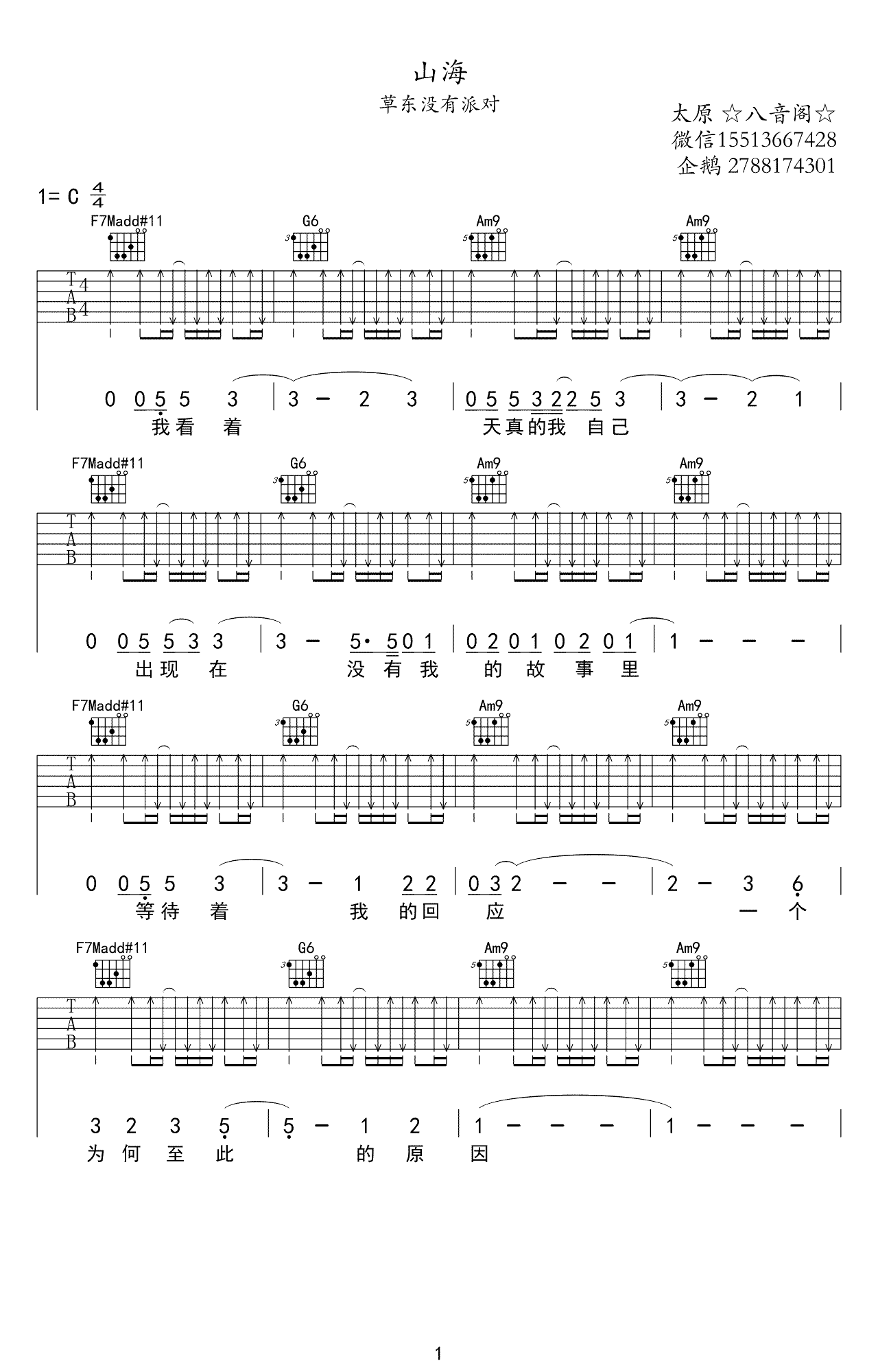 曲谱介绍: 草东没有派对《山海》吉他弹唱谱,采用C调指法编配原版,共有4张高清图谱。