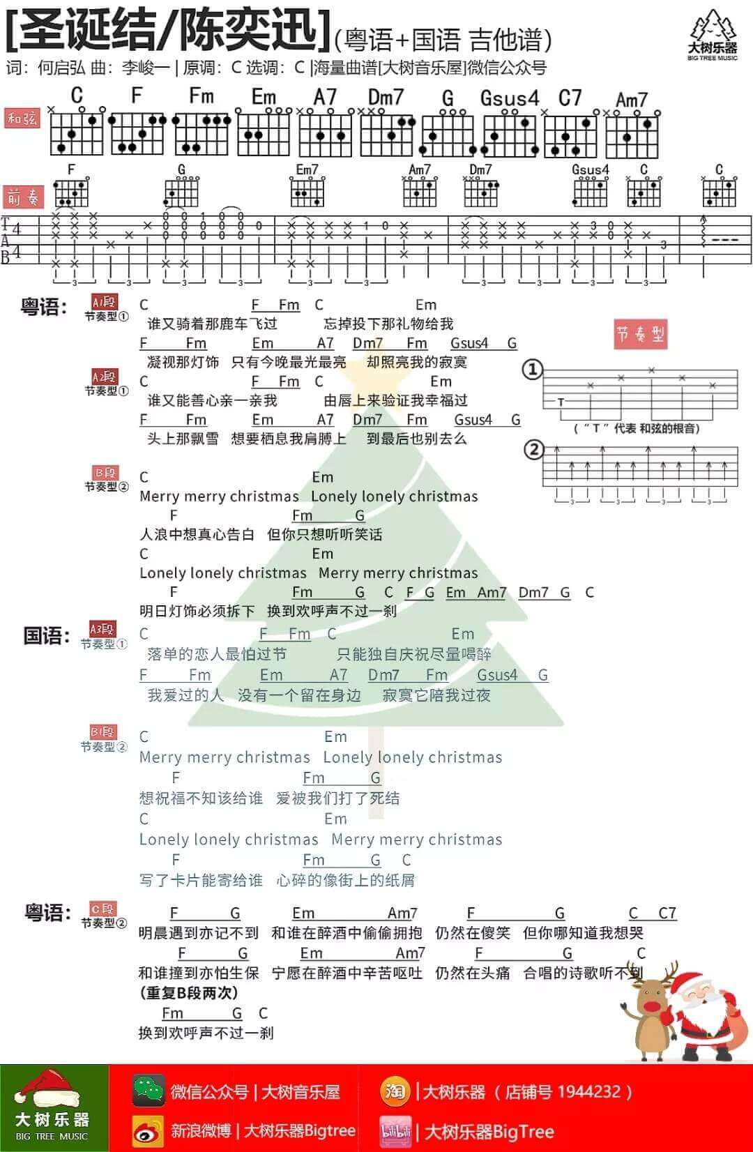 曲谱介绍: 圣诞节吉他谱采用了C调指法,由大树音乐屋编配完成。这首歌曲的旋律十分好听,受到了很多人的支持和喜爱,这首歌曲是在某一个圣诞节的时候班里聚会一个同学演唱的一首歌曲,陈奕迅深情的演唱深深地打动了我。重要提示:宝贝结婚吧吉他谱更新啦,学完这首后,顺便把下首学了吧。 <iframe src="//v.qq.com/txp/iframe/player.html?origin=https%3A%2F%2Fmp.weixin.qq.com&vid=i0816wts3eo&autoplay=false&full=true&show1080p=false&isDebugIframe=false" width="880"</iframe> 吉他弹唱演示及视频教学