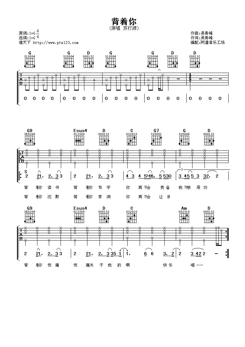 曲谱介绍: 背着你吉他谱采用了G调指法,由阿潘音乐工场编配完成。另外一首,秋蝉吉他谱也很赞,小伙伴可以愉快的学习起来了。