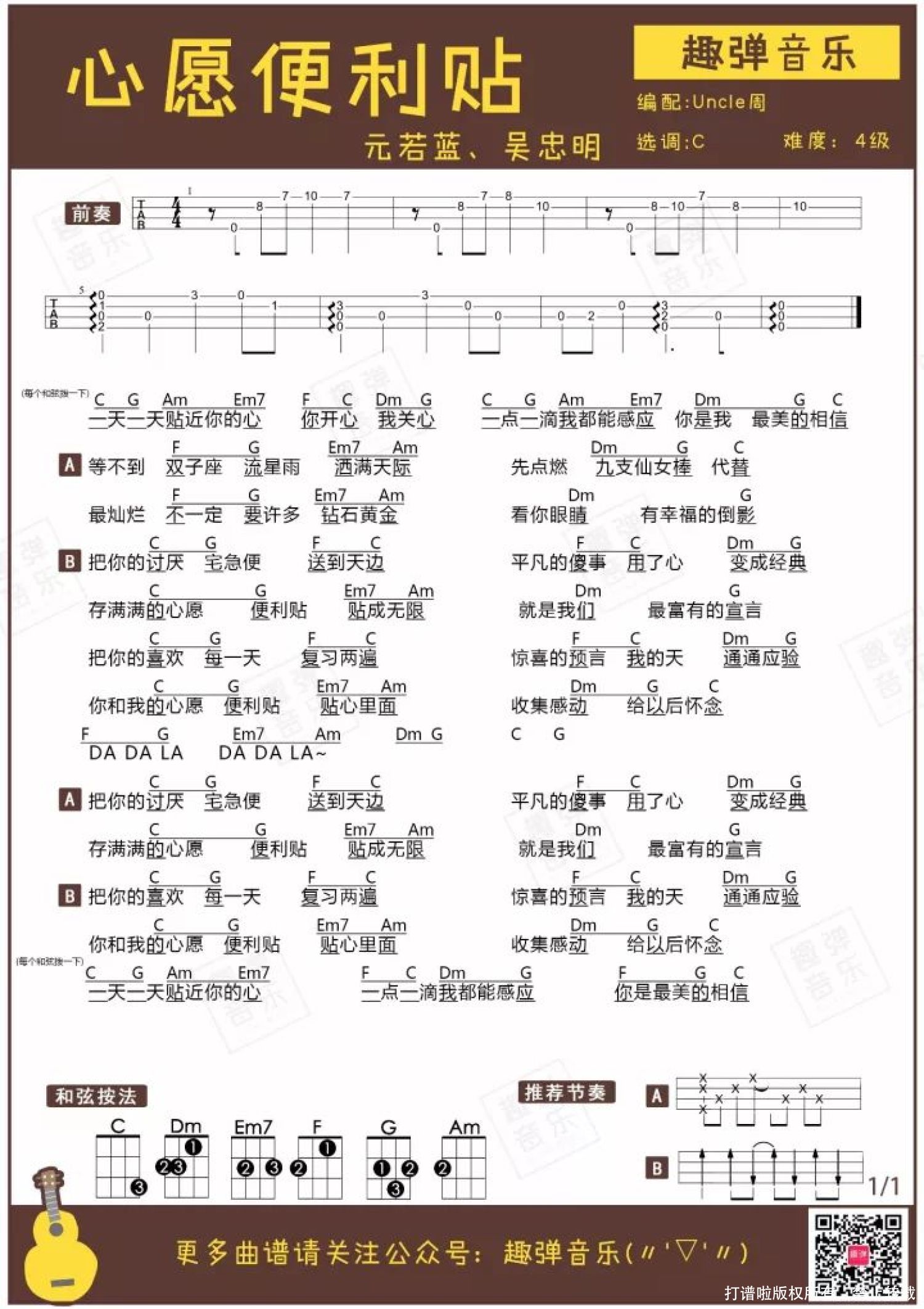 曲谱介绍: <心愿便利贴> 不愧是偶像剧片尾曲,甜到冒泡!   《心愿便利贴》尤克里里谱 这首甜甜的歌唱道:“等不到双子座流星雨洒满天际,先点燃九支仙女棒代替……”今天真的有双子座流星雨哦,小伙伴们有看到新闻直播吗? 追偶像剧,花痴男主角、羡慕女主角是广大少女不变的爱好之一。 看着剧中的CP们发糖撒狗粮,就算是小编这样的老阿姨也忍不住冒起粉色泡泡,幻想自己也能有偶像剧一般的恋情。 今天分享的弹唱曲谱,就是来自超级经典的偶像剧《命中注定我爱你》的片尾曲——《心愿便利贴》。 这首歌是剧中男女主角相遇相爱故事的真实写照,满满都是少女心! 命中注定我爱你   这部由阮经天、陈乔恩主演的电视剧,一度成为台湾收视率最高的偶像剧。 剧情依旧是平凡女孩与霸道总裁的老套设定:朴素不起眼的女主角陈欣怡走错房间,莫名其妙与帅气多金的男主角纪存希共处一室过夜后,被最强助攻——一心只想抱孙子的奶奶强行配对。 男女主角为了满足奶奶的愿望,假装情侣约会交往,最后喜闻乐见地假戏真做了。 偶像剧就是这样,剧情狗血却又让人欲罢不能……当年《命中注定我爱你》热播时,全世界女生都在讨论它的剧情走向。也是因为这部剧,让又帅又萌的阮经天一炮而红。   便利贴女孩 这部剧的女主角陈欣怡,是典型的便利贴女孩:因为善良脾气好,经常被人呼来唤去帮小忙,就像随手可撕的便利贴。 白富美毕竟是少数,像陈欣怡这样便利贴女孩才能代表大部分平凡朴素的我们。 即便普通到不起眼的女生,也有遇到命中注定的白马王子的权利。片尾曲《心愿便利贴》便是大部分平凡女生的美好心声。   最灿烂不一定要许多钻石黄金 看你眼睛有幸福的倒影   不强求灰姑娘一般的美好奇遇,只要遇到对的人,每天都能甜如偶像剧 9年过去了,我们已经不是当年追剧时的青涩小女孩,但这首《心愿便利贴》依然能甜到血糖飙升。 拿起小U弹唱这首冒着粉色泡泡的歌,一起回味不变的少女心吧♪