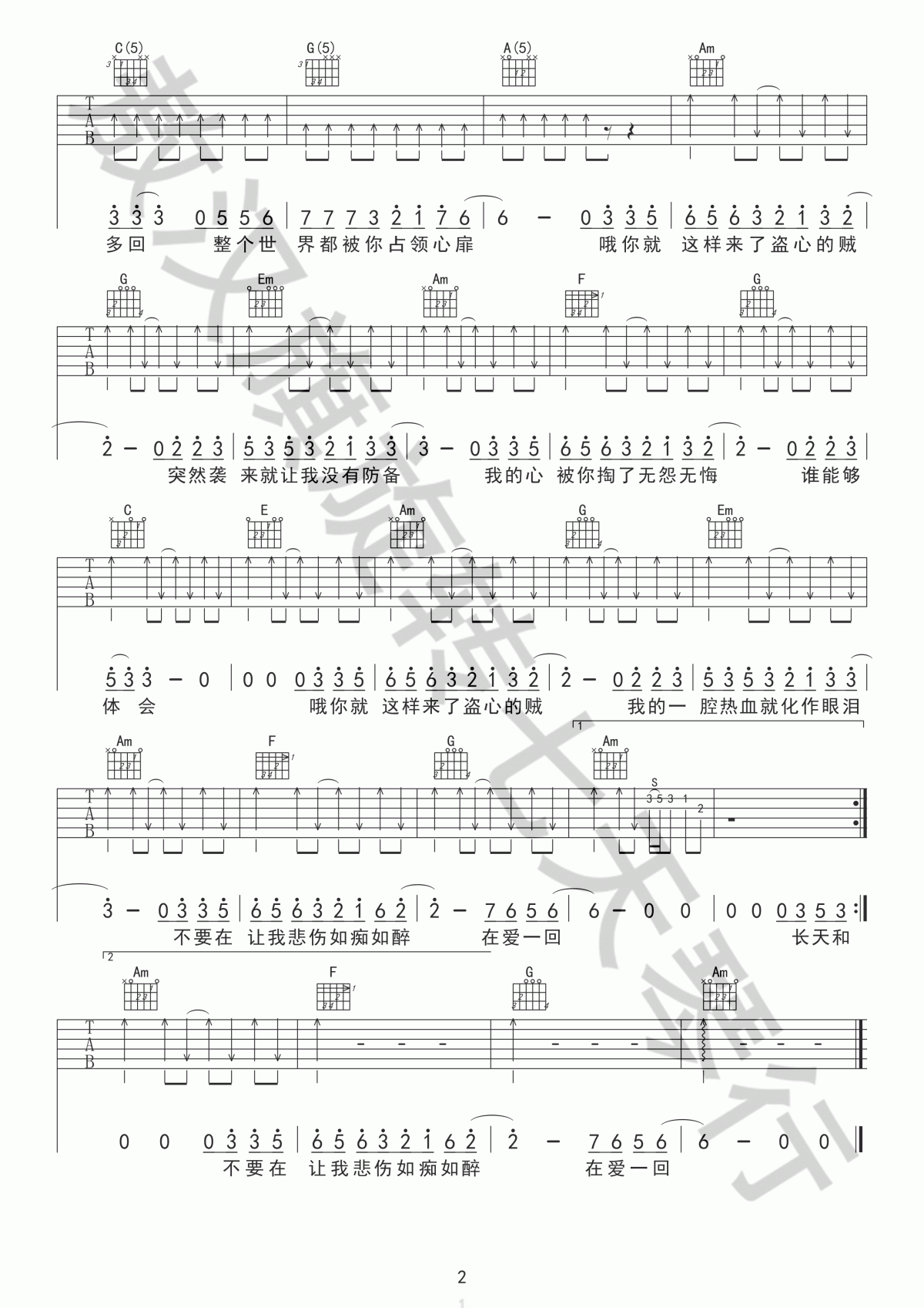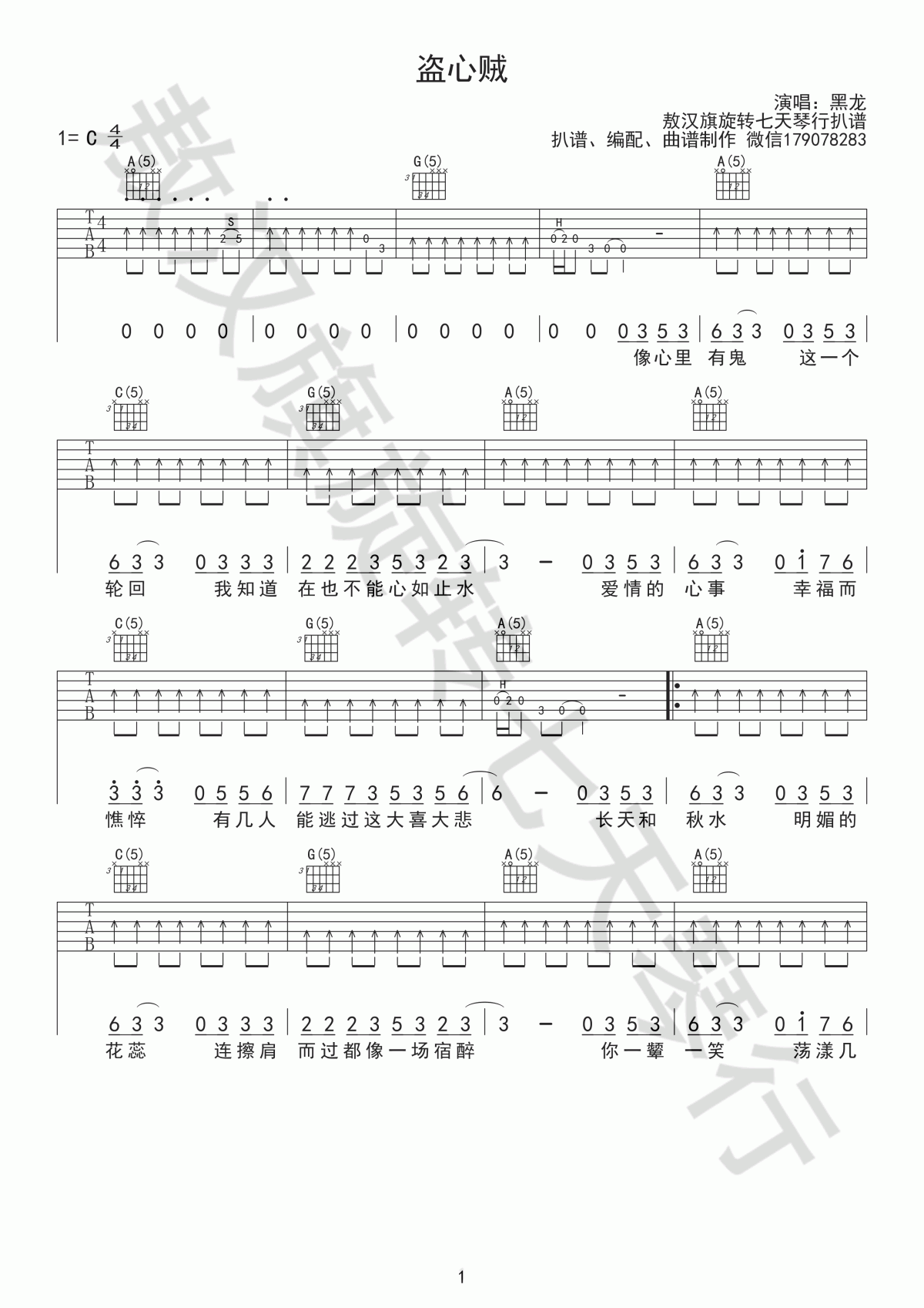 曲谱介绍: 黑龙《盗心贼》吉他弹唱谱,采用C调指法编配原版,共有2张高清图谱,免翻页排版设计。