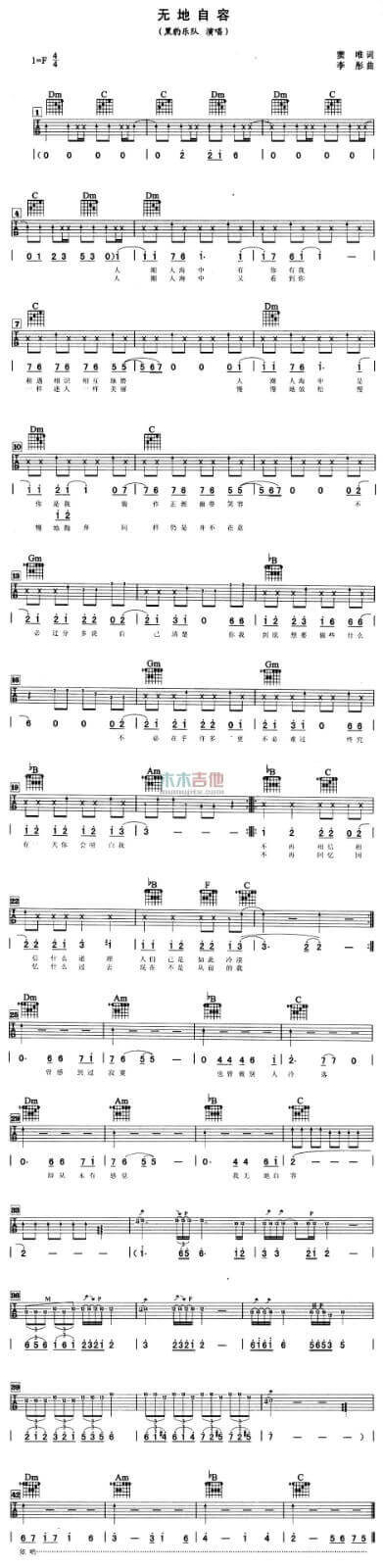曲谱介绍: 无地自容吉他谱采用了F调指法,由木木吉他编配完成。这首歌曲相信有很多人听过,是一首曾经火遍了大江南北的音乐作品,摇滚的风格,酷炫的歌词深得很多人的喜爱。重要提示:qq爱吉他谱更新啦,学完这首后,顺便把下首学了吧。