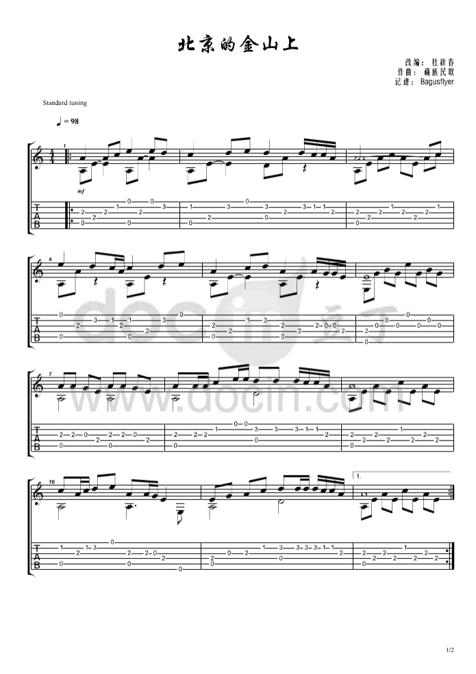 北京的金山上吉他谱 - 藏族民歌 - 吉他独奏谱