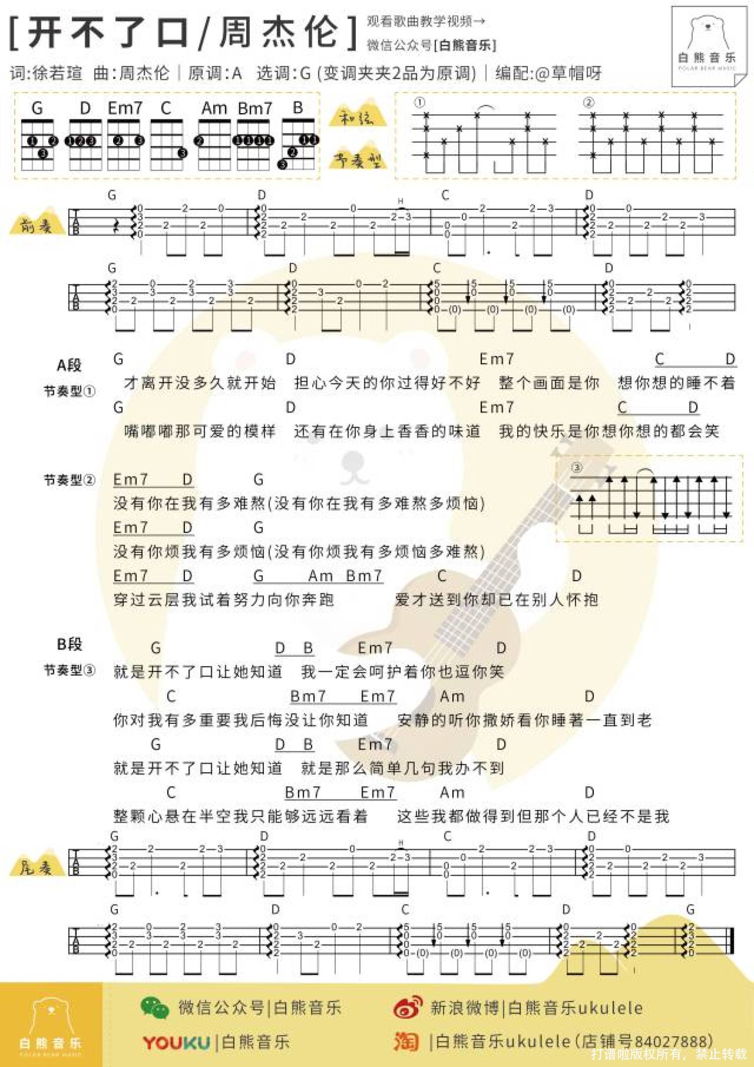 曲谱介绍: “每个惊喜的背后,都是开不了口的我爱你”   杰伦重新编曲《开不了口》。 时隔16年过去了,编曲从原来更偏重节奏感的鼓点,转为更柔和的钢琴和铉乐。开不了口的故事,也从爱情扩展到了人生的各个阶段和各种角色。 尤克里里弹唱教学   开不了口尤克里里谱 女生唱可以用变调夹夹2品,然后直接按照谱子弹就好啦~