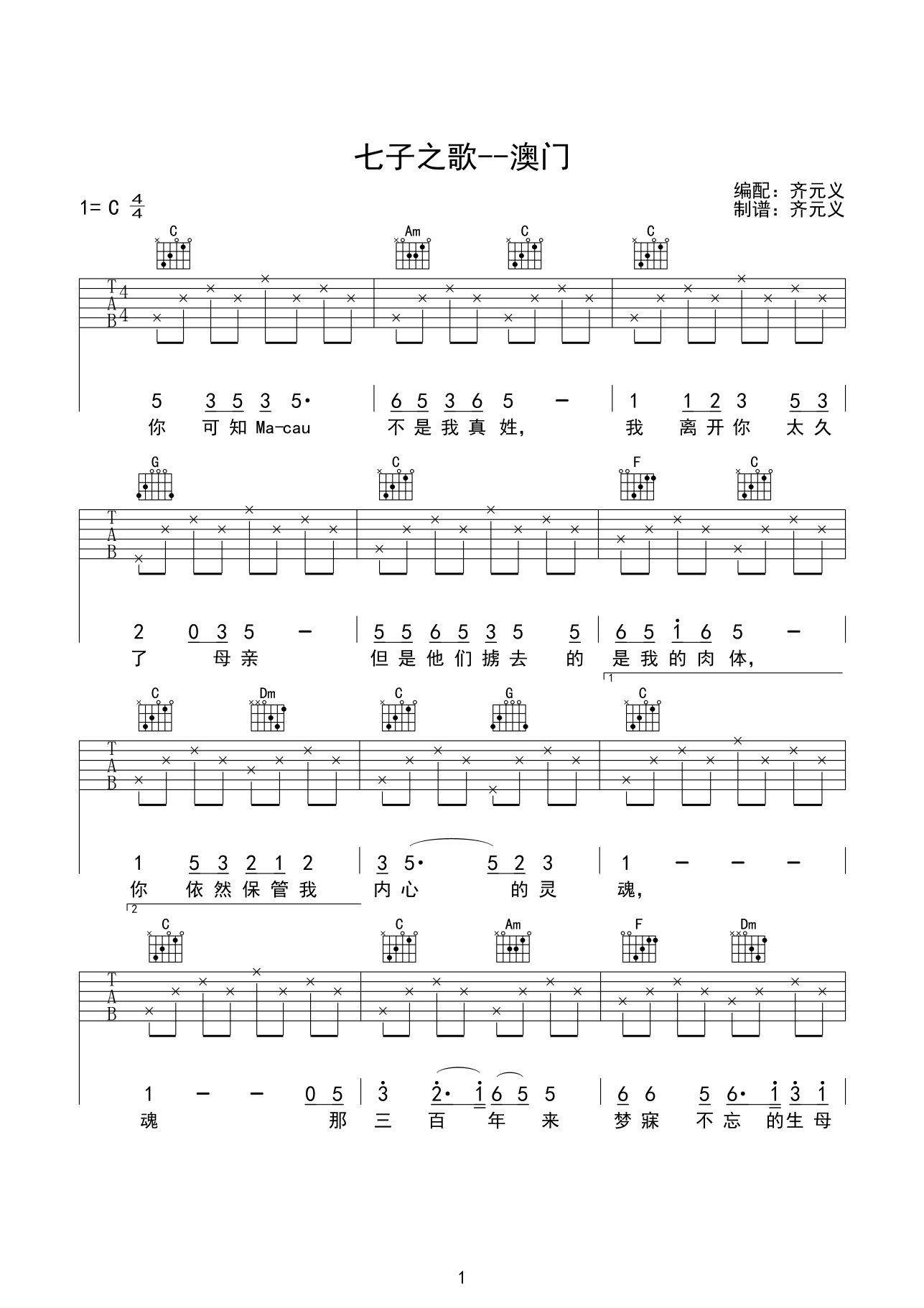 曲谱介绍: 七子之歌吉他谱采用了C调指法,由齐元义编配完成。听说,有魅力的帅哥美的都在悄悄练这首绊吉他谱,小伙伴们也快练起来吧~