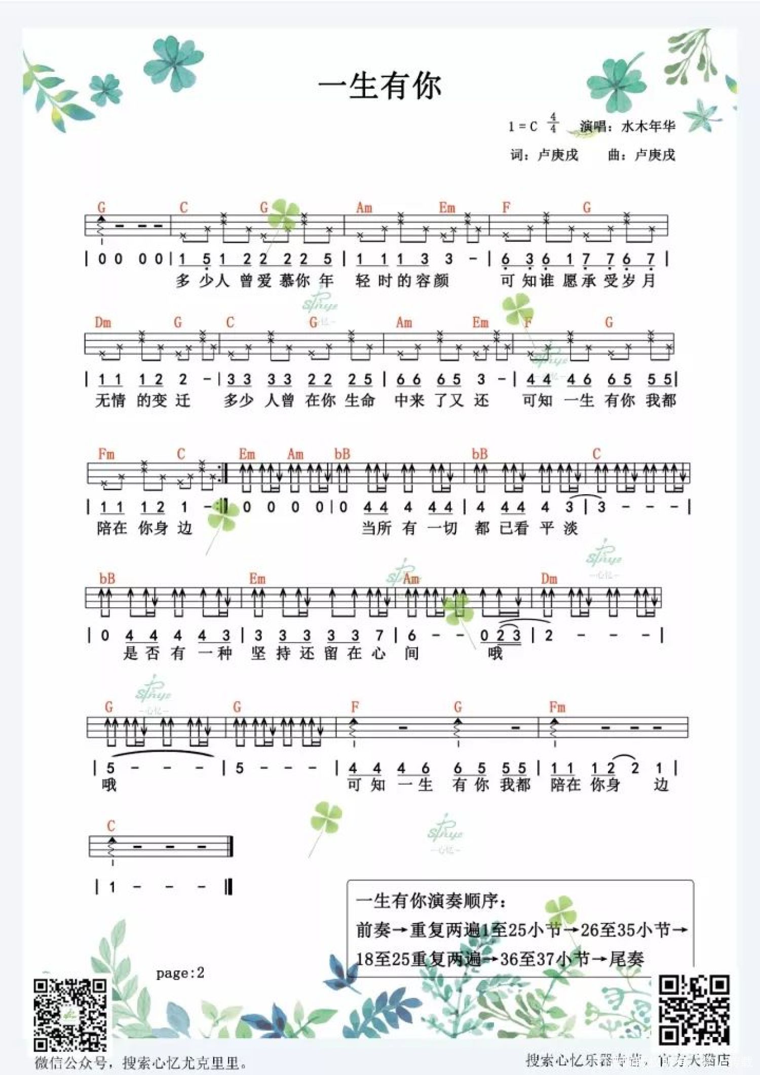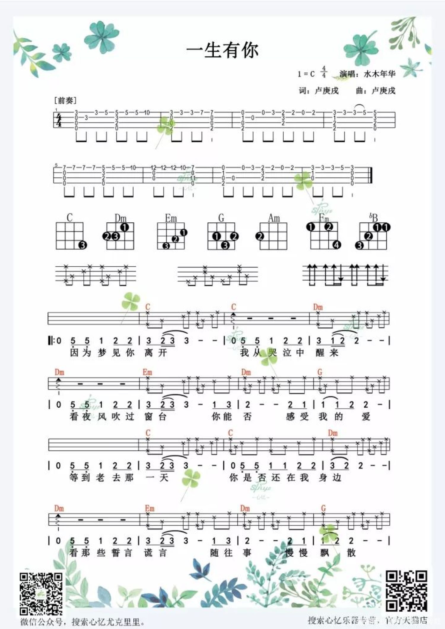 曲谱介绍: 《一生有你》尤克里里弹唱谱   弹唱谱识谱说明:弹唱的结合,看谱子节奏型已经与歌词对应好了,一目了然。 右手节奏型如果初学可以只用第一个。 每小节左手按对应的和弦,右手弹节奏型,嘴巴唱歌词。 小节上方没有和弦与节奏型的,表示只唱不弹。