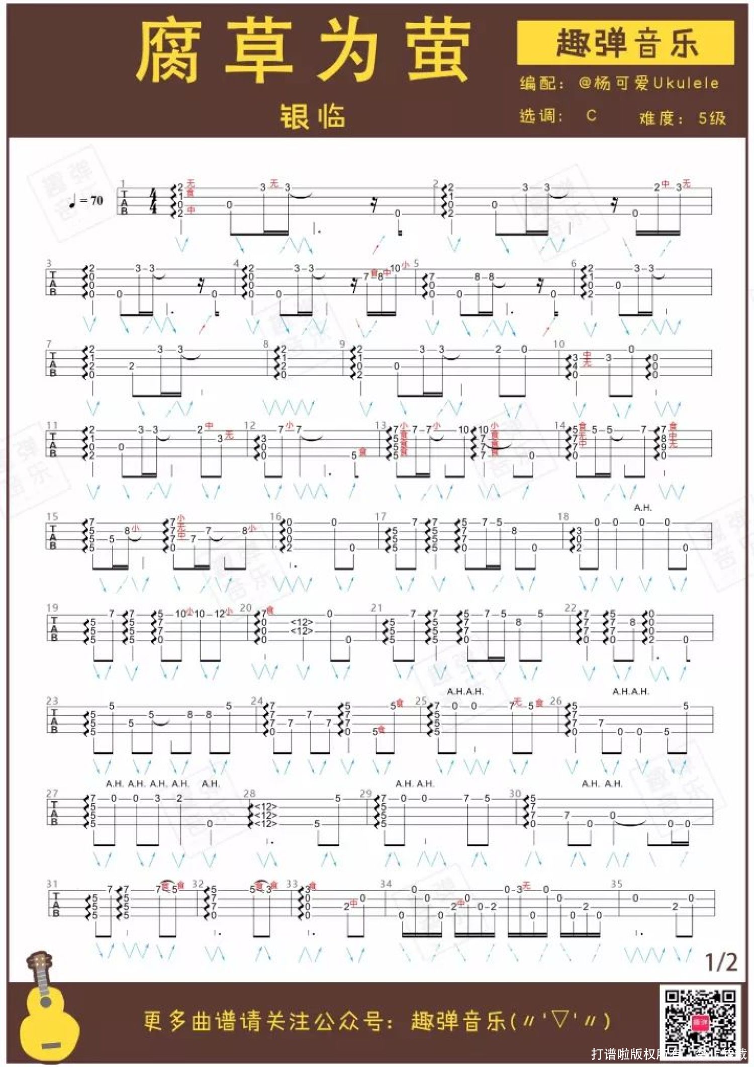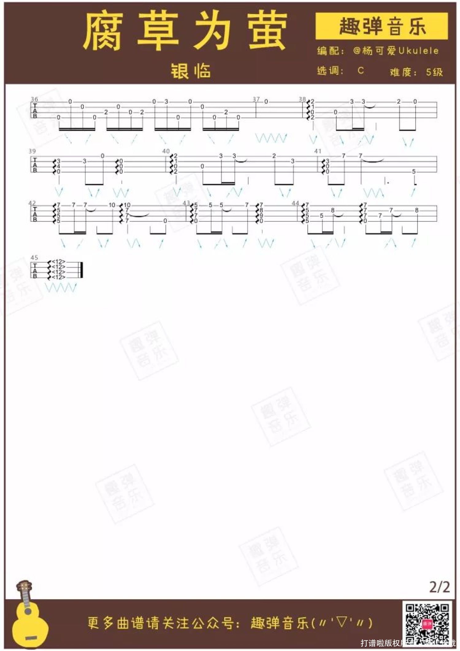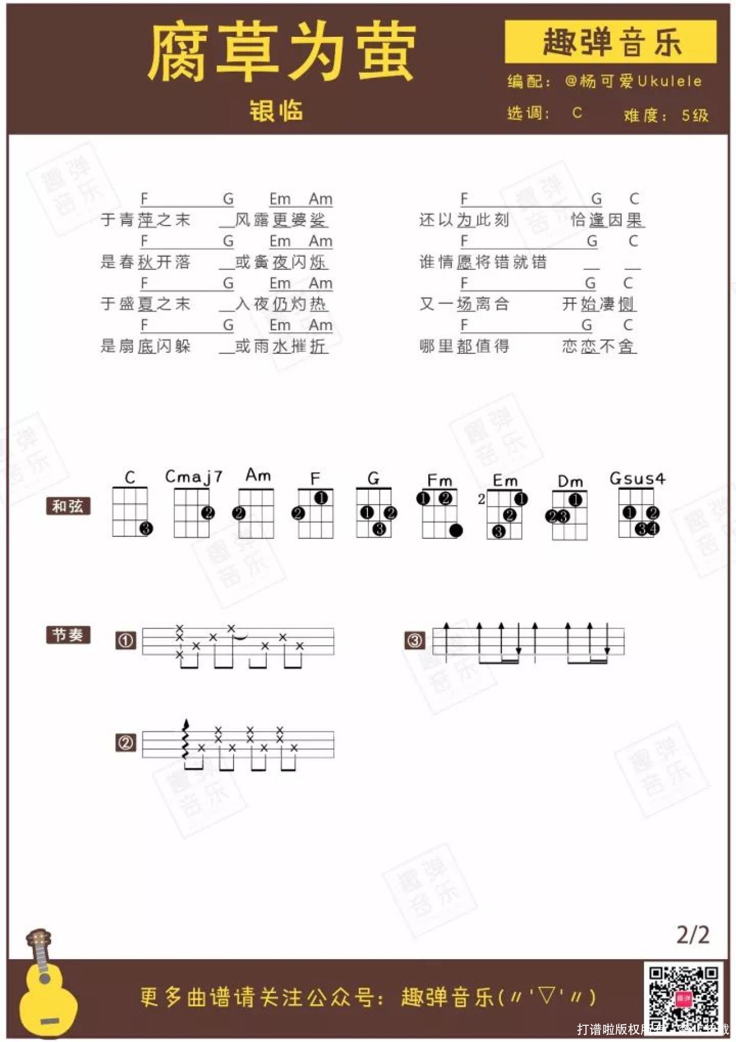曲谱介绍: 一首安静空灵的指弹,美如夏日萤火   你见过草丛间忽明忽暗的萤火虫吗?它们闪烁的光芒温柔美丽,捧在手上,就像摸到了天上的星星。 儿时的记忆中,在夏天的晚上,最喜欢做的事情之一就是跑到草丛里捉萤火虫。 长大后,城市被钢筋水泥包围,越来越少见到萤火虫了。 今天杨可爱带来的这首指弹,讲述了一个有关萤火虫的故事。快来听听,这细腻温柔的琴声里,有没有儿时夏夜的回忆?   《腐草为萤》指弹演示   歌曲故事   ● 《腐草为萤》由银临、灰原穷作曲,择荇填词,并由银临演唱。 ● 收录于银临首张原创同名专辑中。 腐草为萤,是古代一个很唯美的典故。季夏之时,萤火虫将卵产在枯草上,孵化而出。所以古人认为萤火虫是腐草变成的。 这个时节,气候开始变得闷热,开始向立秋过渡。“腐草为萤”,暗中透露了在炎夏中迫望秋天的心情。 于青萍之末 风露更婆娑 还以为此刻 恰逢因果   《腐草为萤》这首歌,表面上看似描述了季节变换、草虫重生的唯美自然现象。 “青萍之末”形容不知不觉发生最终平息,后来逐渐被用来形容无疾而终的爱情。 或许这是一首带着淡淡悲伤色彩的歌:腐草萤火虽然美丽,但终究暗示着消逝与别离。   小U清亮空灵的音色与《腐草为萤》的旋律完美契合,意境美哭~来收谱弹奏这首动听的指弹吧♪   指弹尤克里里谱   弹唱曲谱