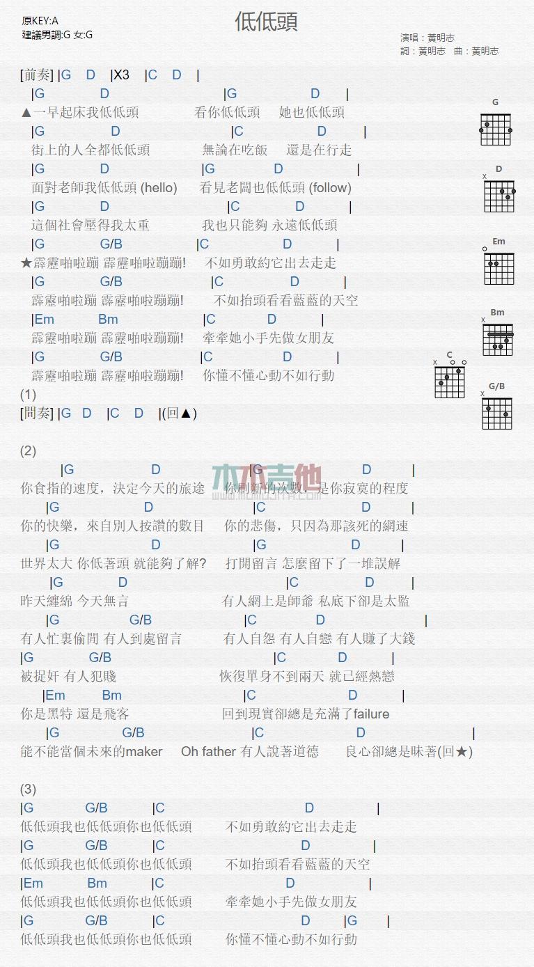 曲谱介绍: 低低头《低低头_》吉他弹唱谱,共有1张高清图谱,免翻页排版设计。