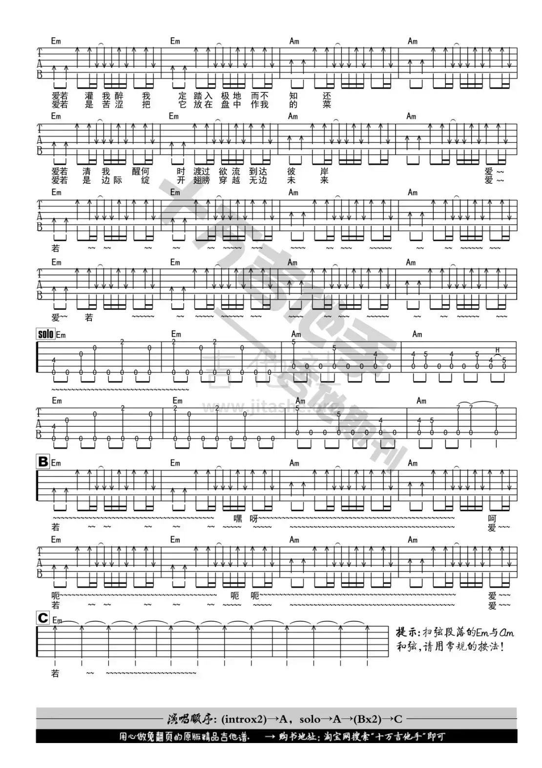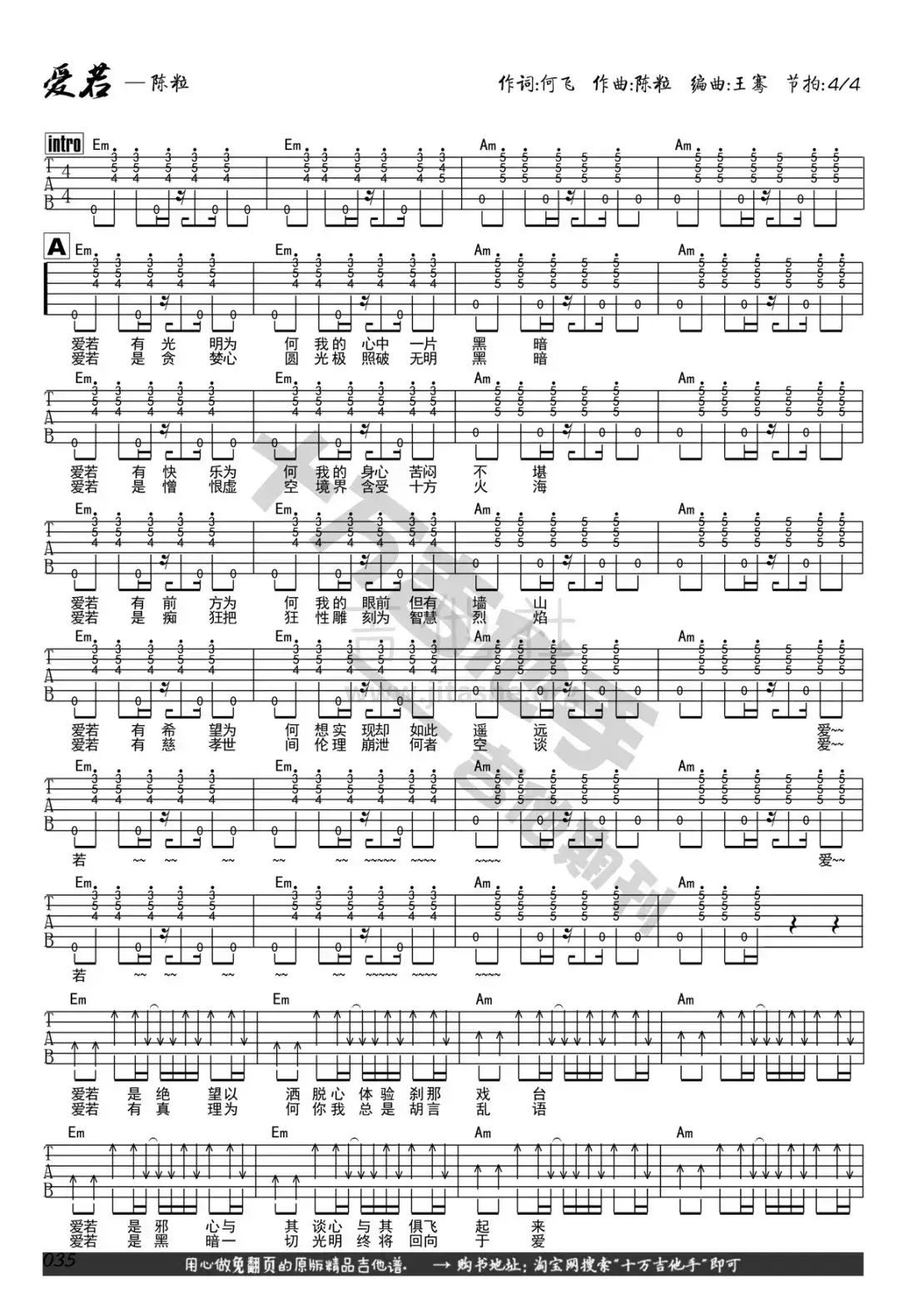 曲谱介绍: 爱若吉他谱由十万吉他手编配完成。很多人说听不懂陈粒的歌曲,但也有很多人对陈粒的歌曲爱的死去活来,陈粒的歌曲总带有一种高级感,唱出了一种豪迈壮阔之感,充满了力量。除了这首谱以外,风花树吉他谱也非常不错,速度去围观一下吧!