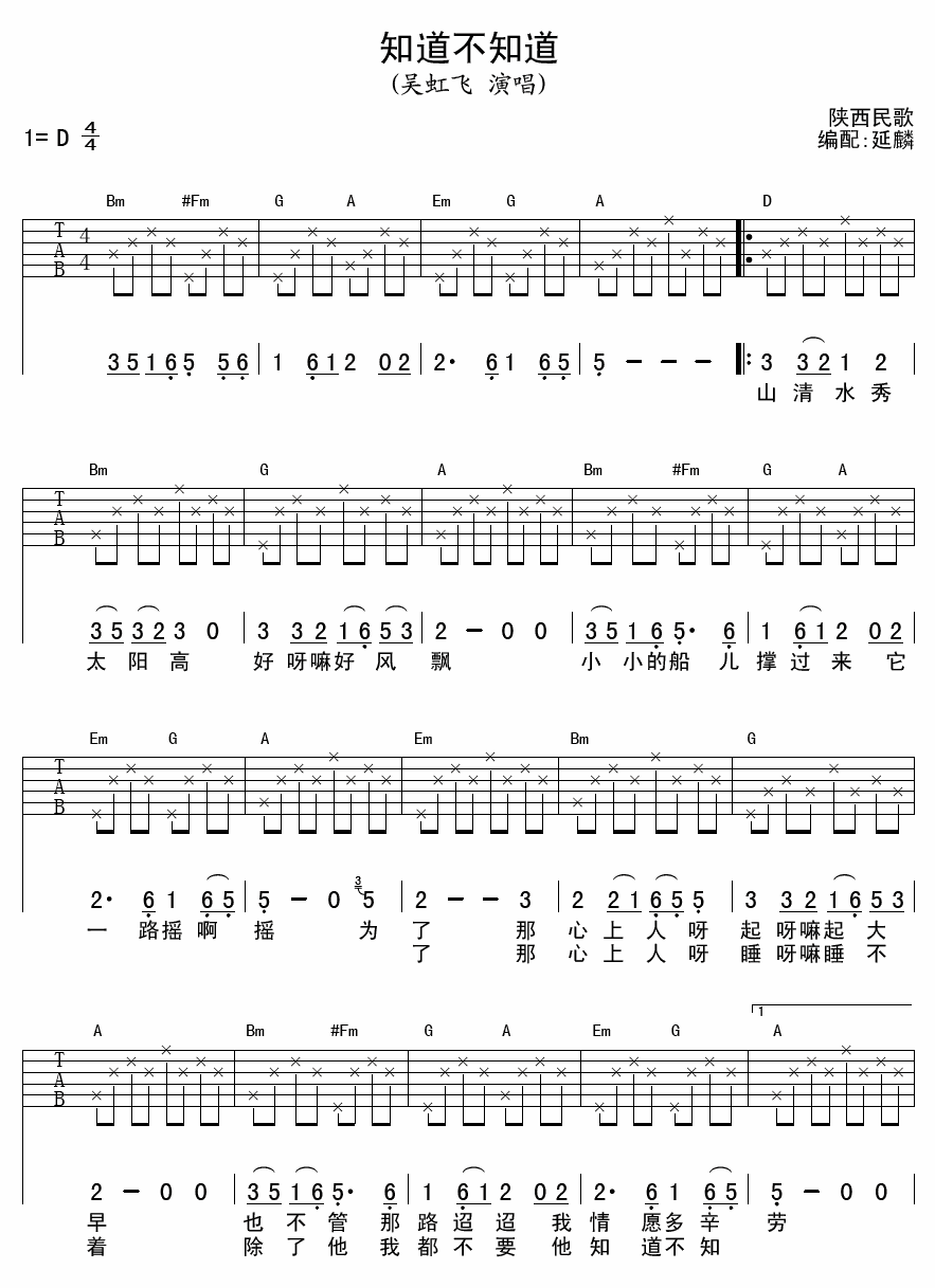 曲谱介绍: 知道不知道吉他谱在用了D调指法,由延麟编配完成。在这首歌曲里面,歌手的嗓音清脆响亮,将歌词里面那种清新明亮的风景唱了出来,让这首作品充满了画面感,让听众听了很有真实感。重要提示:心瘾吉他谱更新啦,学完这首后,顺便把下首学了吧。