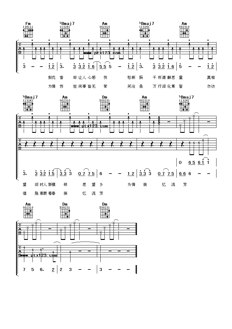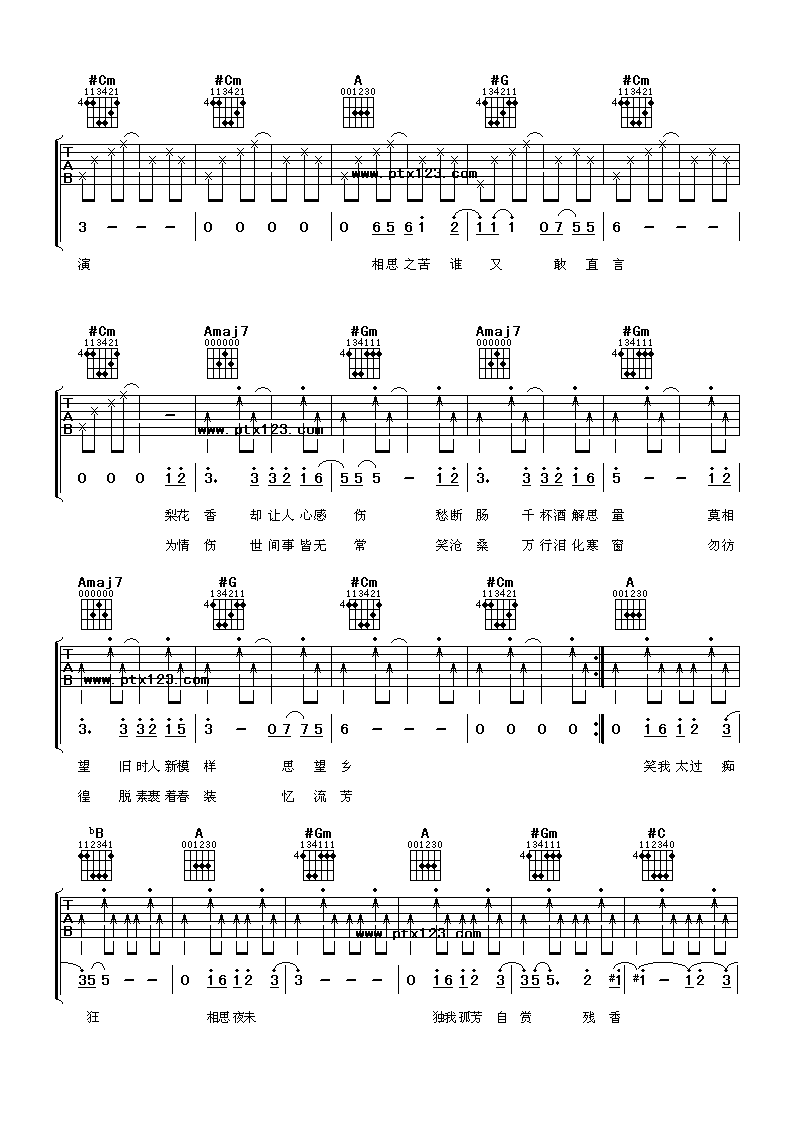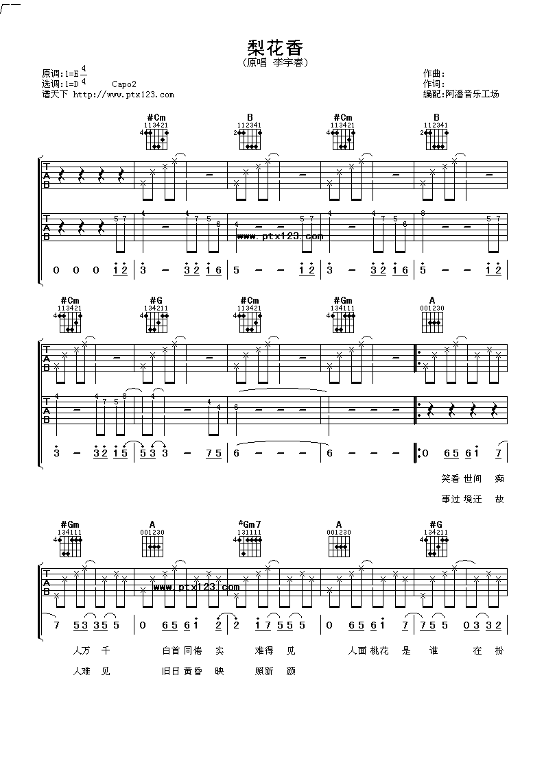 曲谱介绍: 梨花香吉他谱采用了D调指法,由阿潘音乐工场编配完成。这首歌曲的旋律和歌词层次分明,细腻柔美,李宇春深情的演绎让这首歌曲极具感染力,这首歌曲是在述说一个悲伤的爱情故事。李宇春低沉的嗓音将这首歌曲唱出了他自己的味道,让我们感受到了撕心裂肺的痛,在这首歌曲里面我们也能感受到李宇春扎实的唱功和演唱能力。听说,有魅力的帅哥美的都在悄悄练这首教父吉他谱,小伙伴们也快练起来吧~