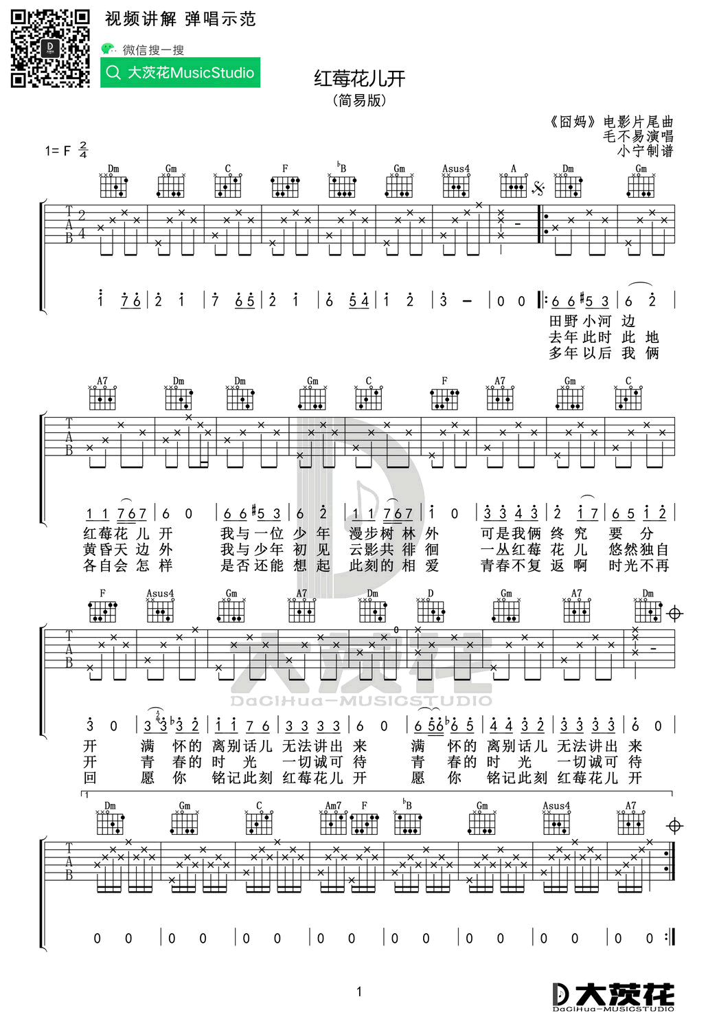 红莓花儿开吉他谱 - 毛不易 - F调吉他弹唱谱