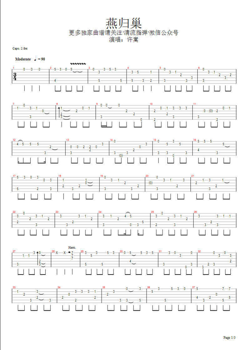 燕归巢吉他谱 - 许嵩 - 吉他独奏谱