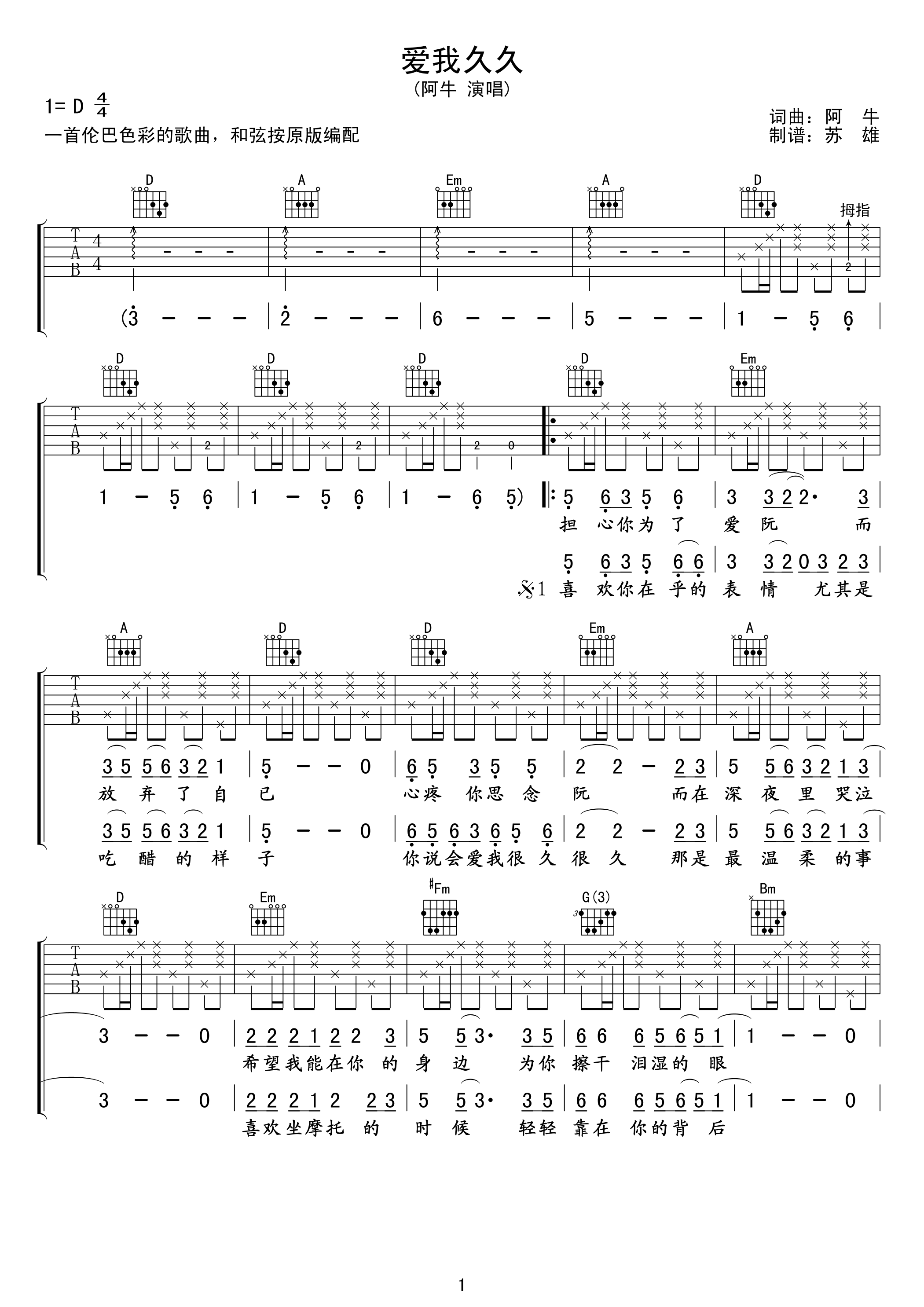 爱我久久吉他谱 - 阿牛 - D调吉他弹唱谱