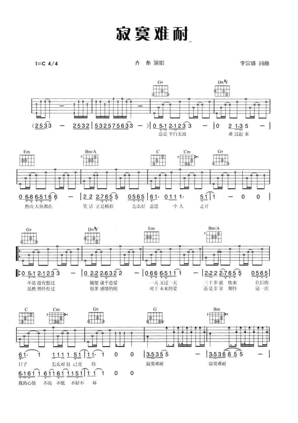 寂寞难耐吉他谱 - 齐秦 - C调吉他弹唱谱