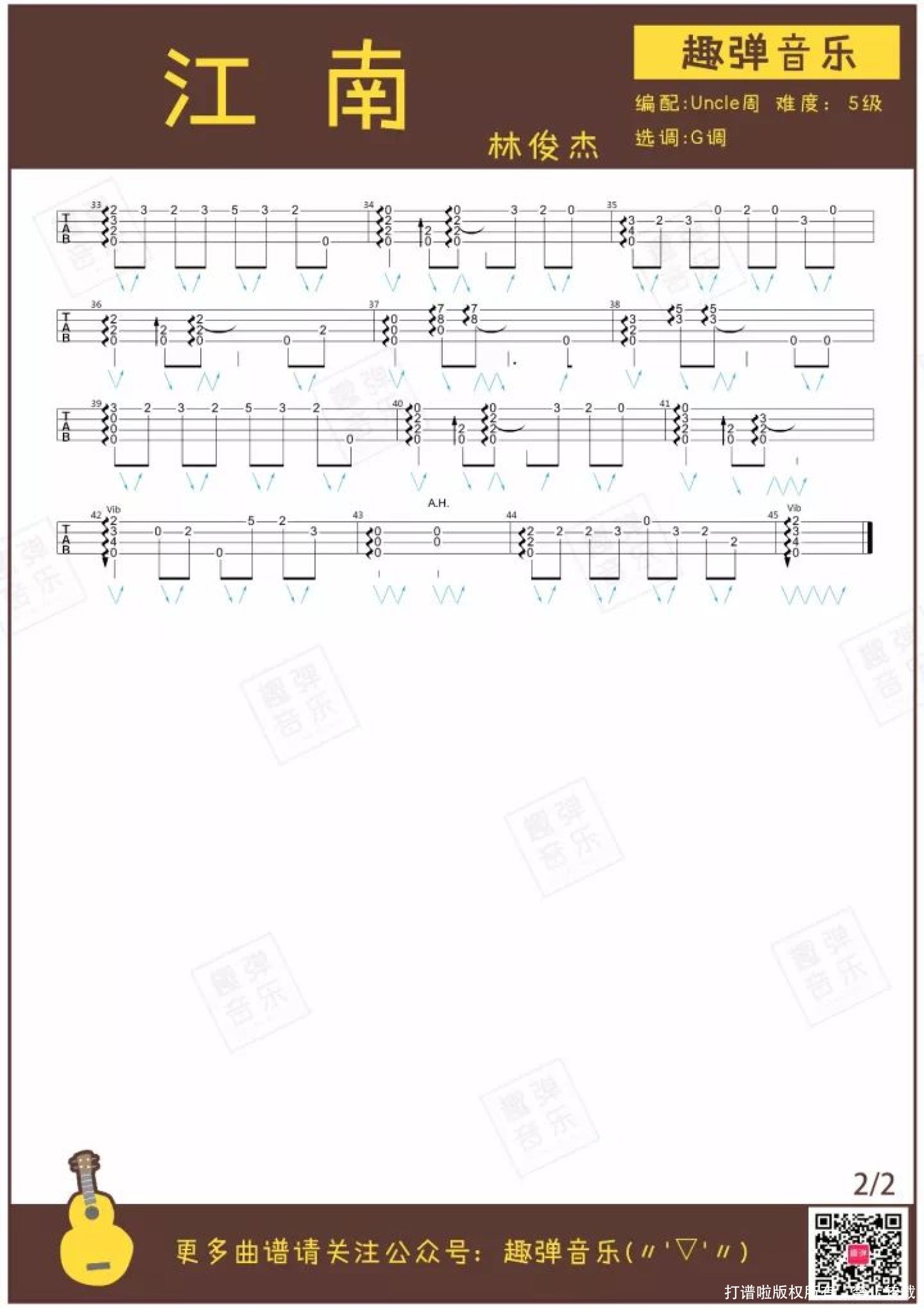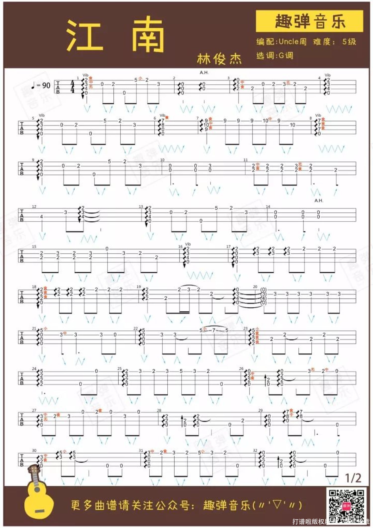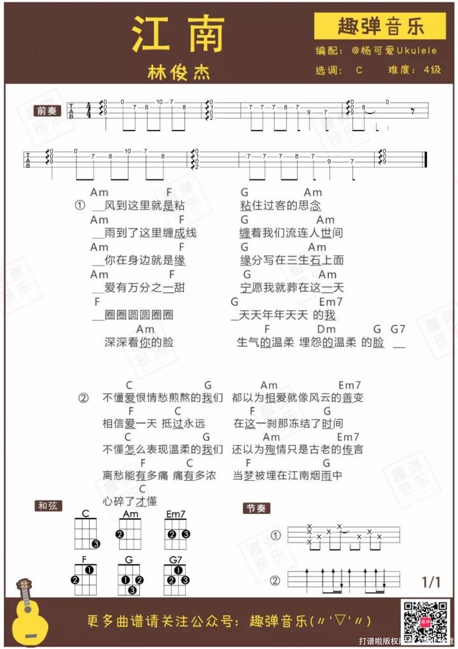 曲谱介绍: 点开下面的视频这首指弹有没有让你感受江南烟雨的缠绵? 作为林俊杰的成名曲,这首温柔深情的《江南》想必大家都不会陌生。 今天Uncle周带来了《江南》的指弹版。让我们先在温柔得像呢喃般的旋律里,回味这首不可复制的华语经典吧♪   指弹演示   关于歌曲   当初在给林俊杰专辑选歌时,《江南》很不被看好。 它似乎是个不伦不类的混血儿:将西方的R&B与中国的洞箫和古筝结合,是一首“时空错乱”的情歌。 在林俊杰的坚持下,《江南》获得了成功。 就算听了一百遍,《江南》前奏中的风声一响起,还是能卷起记忆的涟漪。 在华语乐坛的黄金时代,在“全民周董”的年代,林俊杰靠这首歌火遍内地。 《江南》也陪伴了许多8090后的学生时代。 JJ说,没有这首歌就没有现在的他。每每在演唱会最后与歌迷大合唱《江南》时,感动和回忆都会涌上心头。 经典需要时间的证明。经过13年的沉淀,《江南》依旧经得起回味,经典毋庸置疑。   行走的CD 从抒情的《江南》到摇滚的《曹操》,再到《她说》、《不为谁而作的歌》,JJ每次出新歌,都不会令人失望。 JJ认真打磨自己的音乐,一直保持着高水准,又因为稳出天际的现场唱功,被歌迷称作“铁打的金曲王”、“行走的CD”。 他的歌或许有魔力,让人一听就是十几年。(再次暴露年龄...)   指弹版的《江南》温柔得像吴侬软语,跟Uncle周学起来,给你的小U增添缠绵深情的音乐细胞吧♪   尤克里里教学   指弹曲谱   附:弹唱曲谱