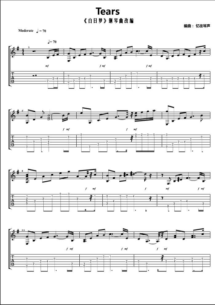曲谱介绍: tears六线谱 调六线吉他谱。由忆往琴声编曲。这首曲子由《白日梦》钢琴曲改编, 《Tears 》真的是一部很动人的作品。音符像一颗颗清澈透明的水珠从泉口缓缓流出,意境颇美。随着乐曲的深入,更是把人牵入了无限的遐想之中。晴朗的天空,一望无际的草坪,微风轻拂柳枝,一个人,陷入回忆,这首柔美舒缓《Tears》伍伍慧的独奏充满张力与感染力,可以用“丰润”来形容,让你难以相信这声音只是由一把吉他鸣奏而出。另外,这首奇妙能力歌吉他谱也超级好听,小伙伴们有福啦,还不去练起来?