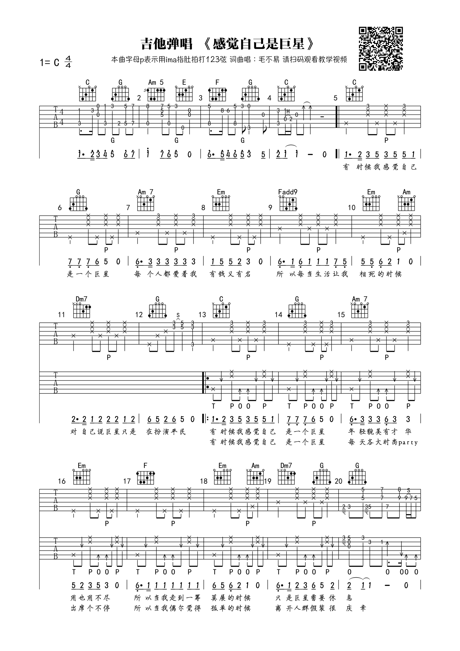 曲谱介绍: 毛不易《感觉自己是巨星》吉他谱_C调吉他弹唱谱