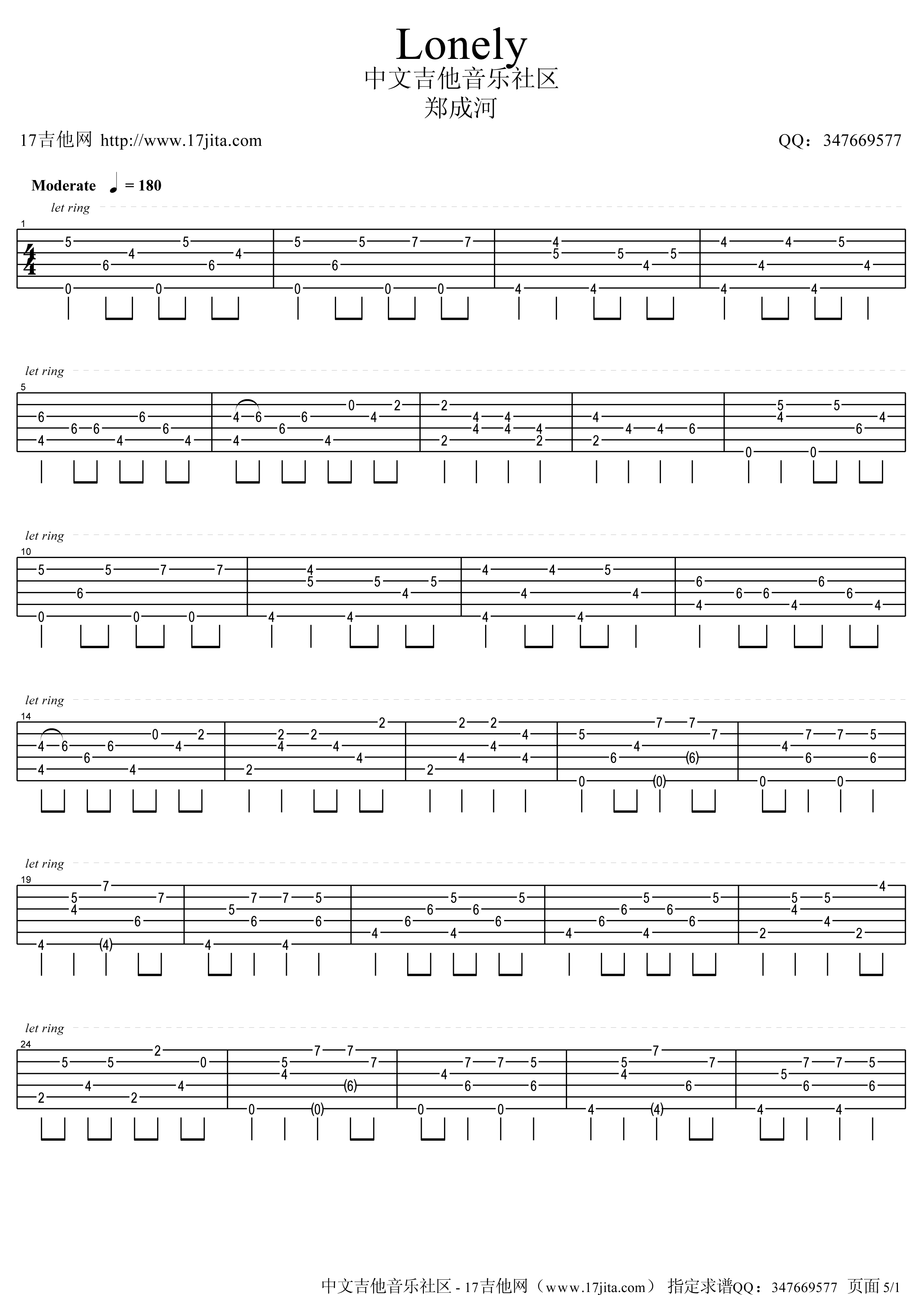 lonely吉他谱 - 郑成河 - C调吉他独奏谱
