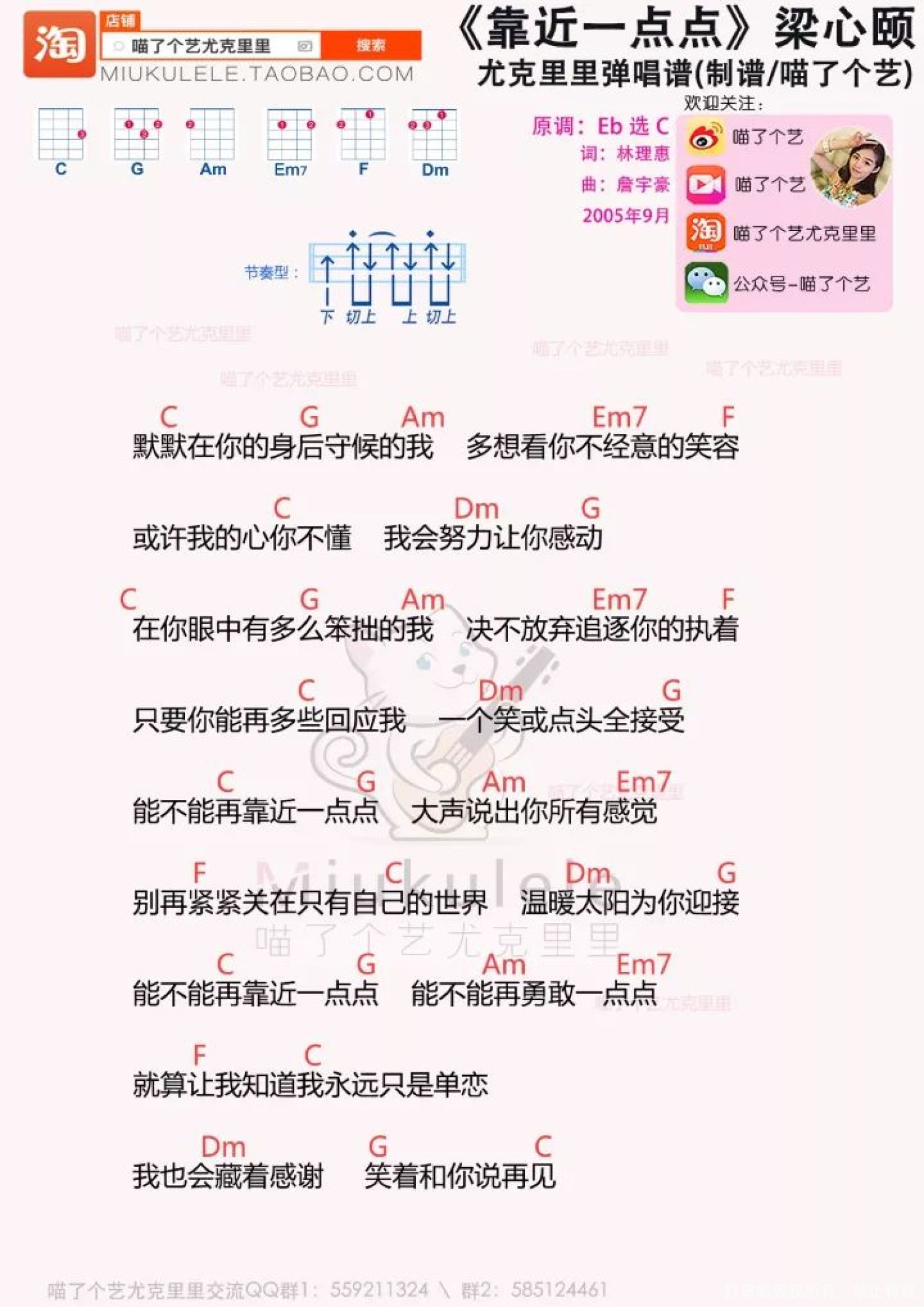 曲谱介绍: 《靠近一点点》尤克里里谱 心情很好,不想睡觉。 有个软妹纸给我发了超长私信, 想要这首《靠近一点点》, 没时间录教程, 那就给个谱子和简单示范。 祝,成功捕获男神!