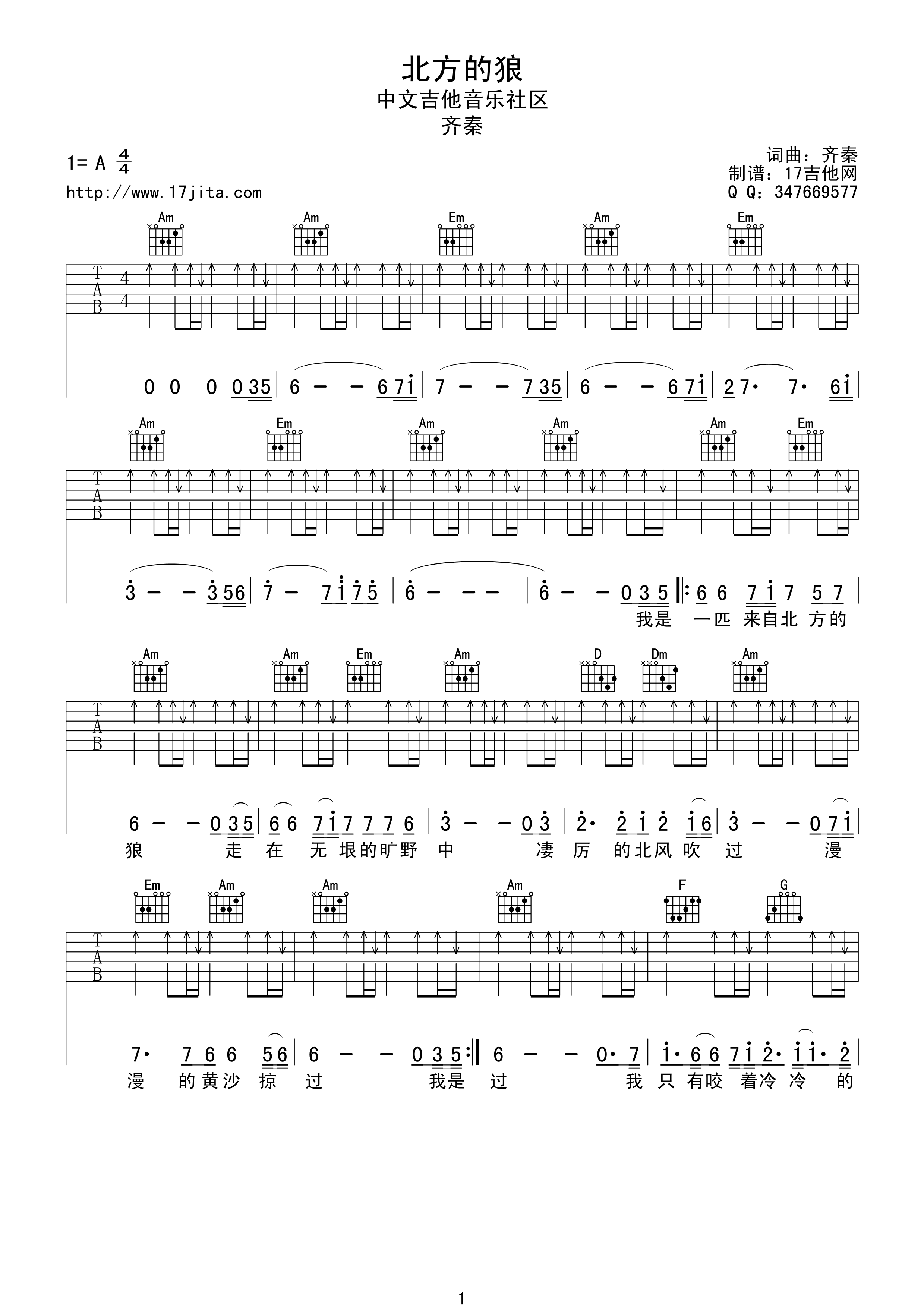 曲谱介绍: 北方的狼吉他谱采用了A调指法,由17吉他网制谱完成。《北方的狼》是齐秦演唱歌曲,由齐秦作词、作曲,收录在其1998年1月1 发行专辑《Chyi Chin》中。歌曲为了描述自己在感化院(少管所)那段时间在“狼群”(狱友)之中生活,就突发奇想创作了《北方的狼》。另外,和这首一样赞的争气吉他谱也非常NICE,大家快去学习吧!