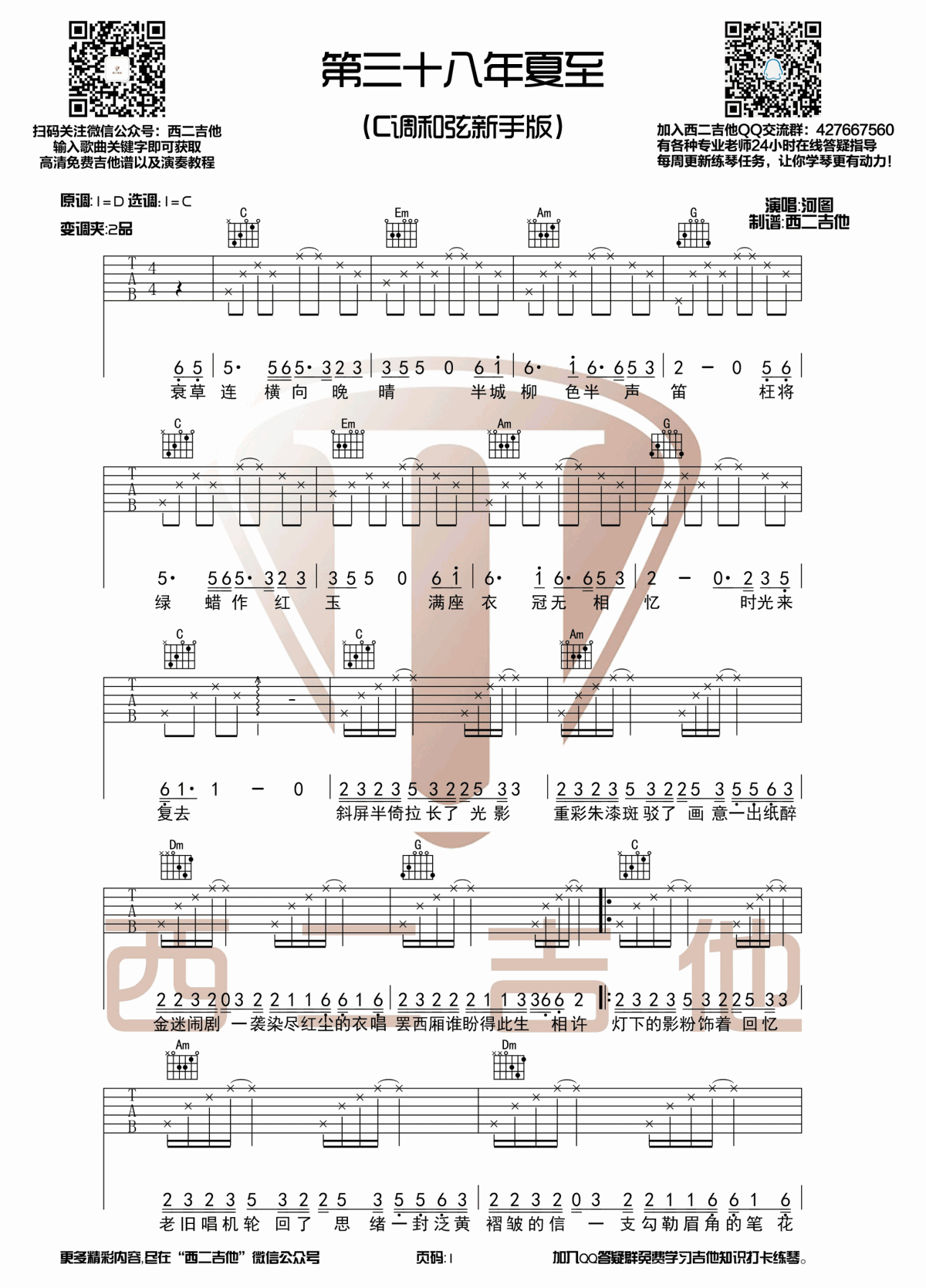 曲谱介绍: 河图《第三十八年夏至》吉他弹唱谱,采用C调指法编配,共有3张高清图谱。