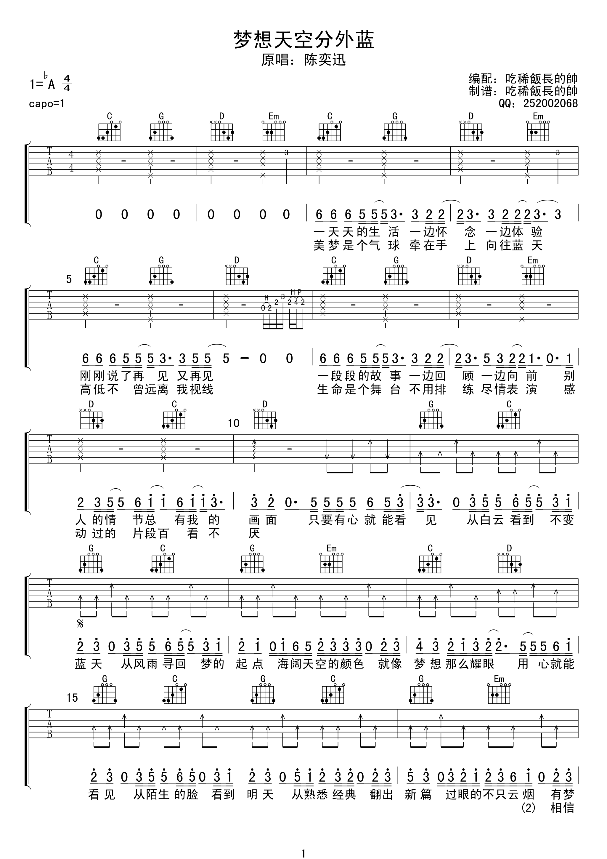 曲谱介绍: 梦想天空分外蓝吉他谱采用了A调指法,由吃稀饭长得帅编配编谱。这首歌曲由陈奕迅演唱,他不但慎重地对歌曲的风格、节奏进行“调研”,更推荐了自己的御用作曲人郭伟亮为《梦想天空分外蓝》作曲,使得歌曲更加完整。重要提示:忘了哭吉他谱更新啦,学完这首后,顺便把下首学了吧。