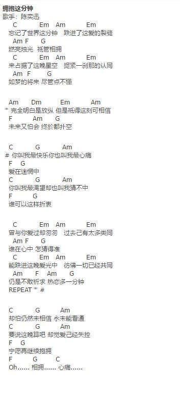 曲谱介绍: 抱拥这分钟吉他谱采用C调弹唱。陈奕迅唱功大家有目共睹,他唱的这首《抱拥这分钟》在这首歌曲之中,让我们感受到了爱情的深刻。另外,和这首一样赞的阿怪吉他谱也非常NICE,大家快去学习吧!