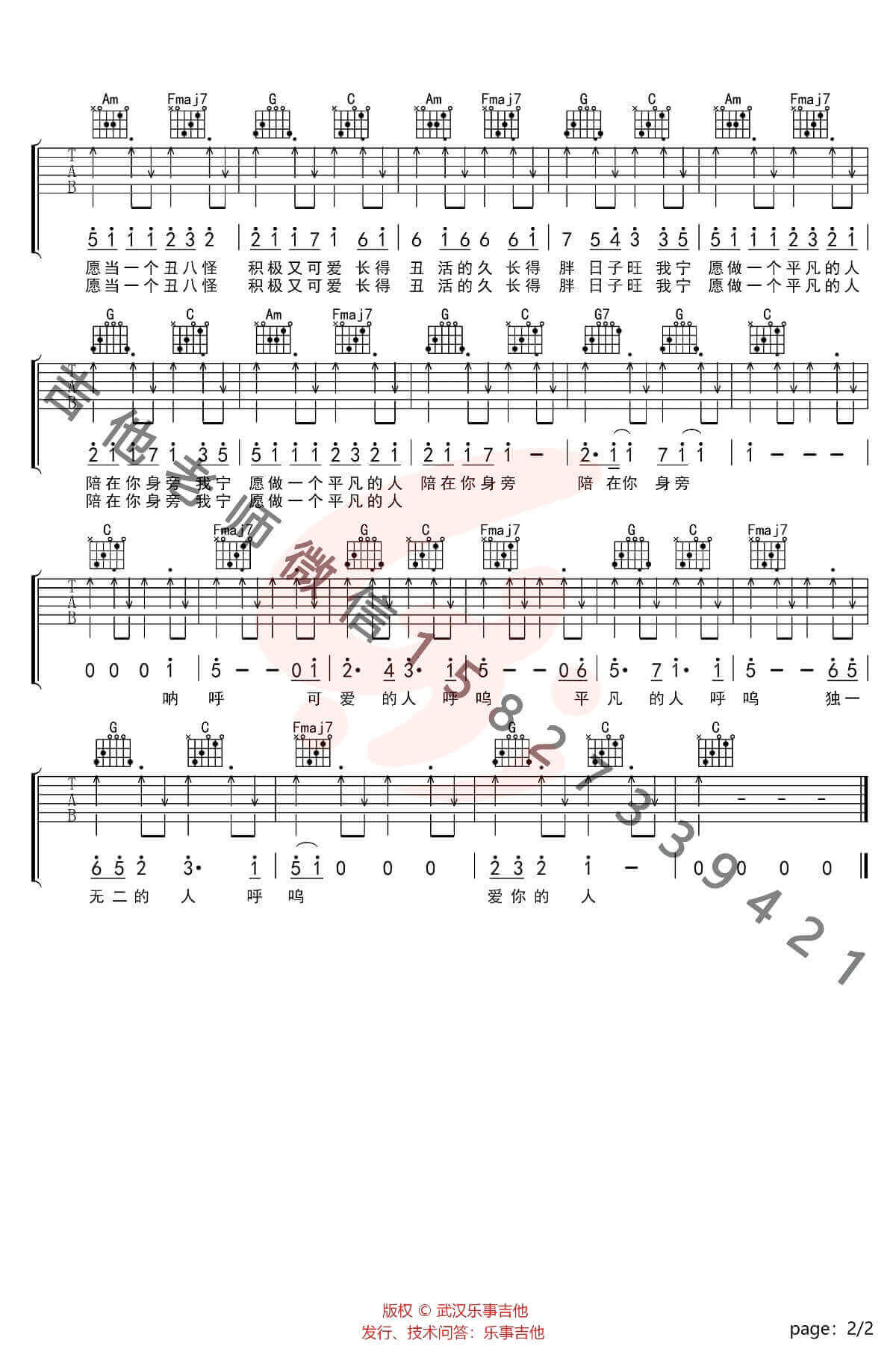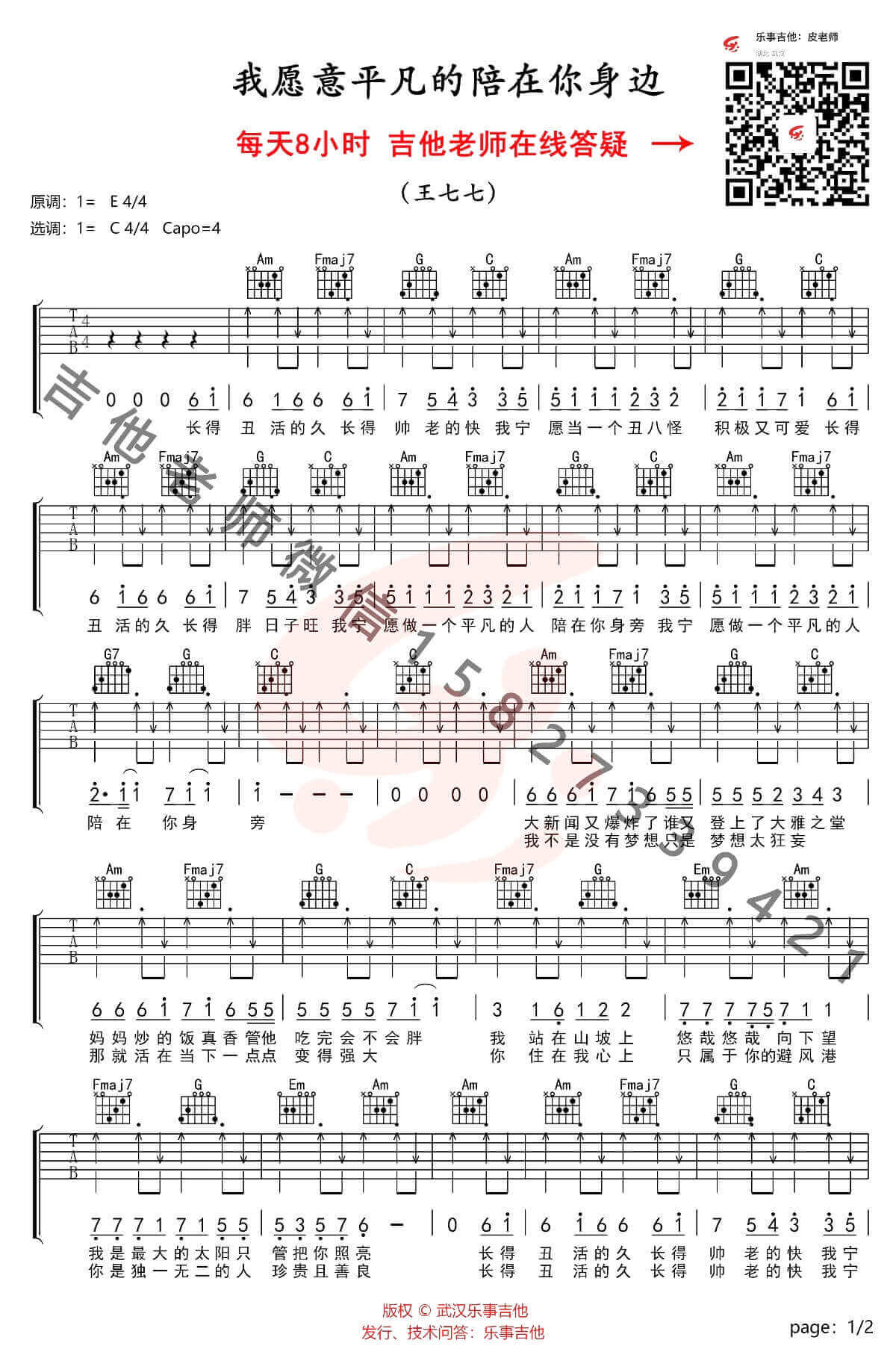 曲谱介绍: 我愿意平凡的陪在你身旁吉他谱采用了C调指法,由乐视吉他做谱完成。我愿意平凡的陪在你身旁由由王七七演唱的一首歌曲。我愿意平凡的陪在你身旁这首歌发布于2019年3月份,音乐风格偏流行歌曲。听说,有魅力的帅哥美的都在悄悄练这首太聪明吉他谱,小伙伴们也快练起来吧~