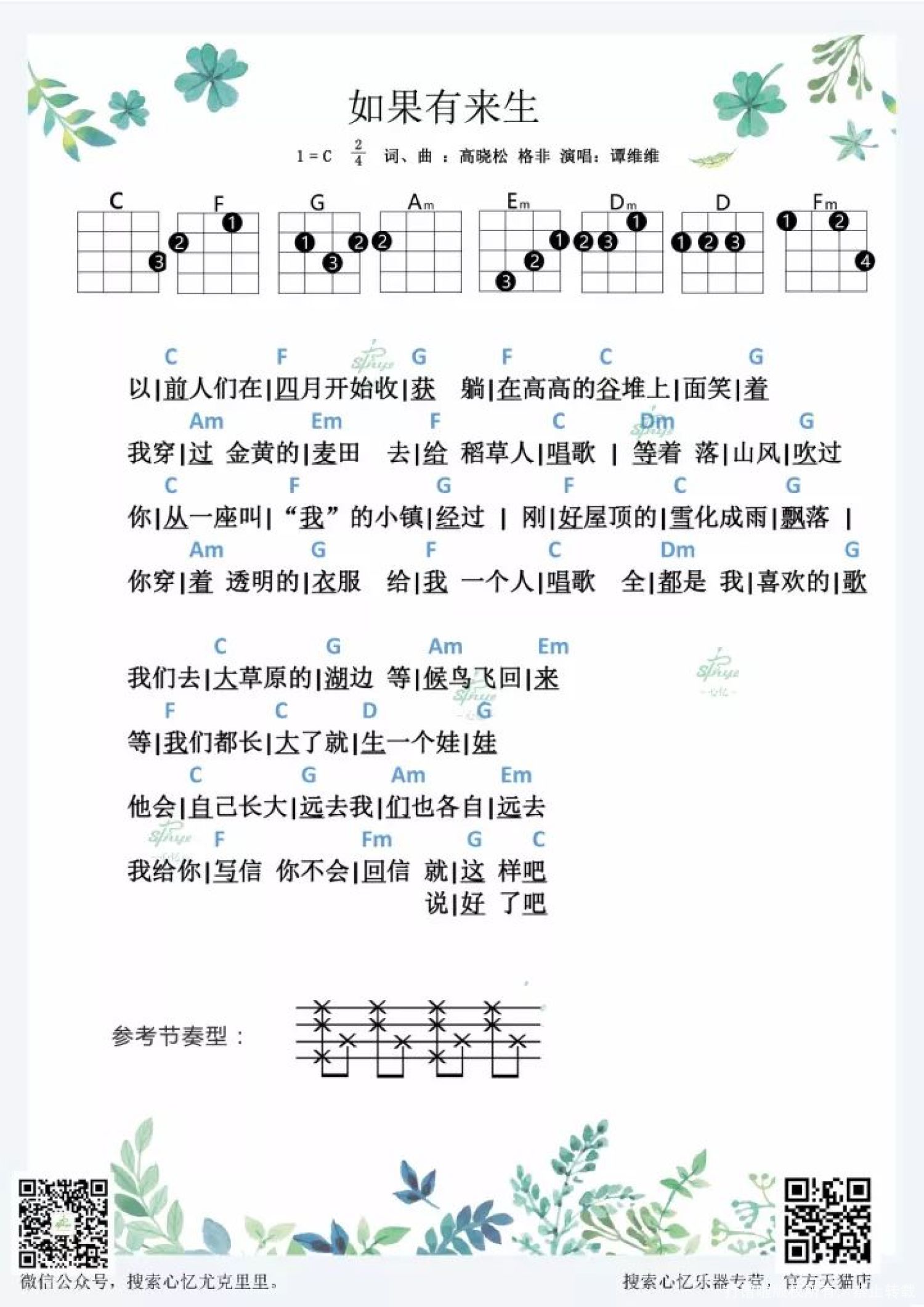 曲谱介绍: 《如果有来生》尤克里里谱   《如果有来生》歌手谭维维演唱的一首歌曲,是一首被誉为世外桃源代表作的歌曲。 由音乐制作人高晓松为《如果有来生》填词,如咏诗般地刻画出如诗画的绝美歌词,营造世外桃源的幻想意境。歌词内容描写憧憬简单的大草原生活,与爱人远离尘世的日子。 创作这首歌的灵感来源于在一个凉爽的秋夜,谭维维坐在郊外安静的酒吧里,向高晓松谈到爱情这个话题时静静述说的内心感悟。 ◆  ◆  ◆  ◆  ◆   同时凭借着清新美好的青春气息,为这段不染烟尘的情怀配上了充满画面感的音乐。作为制作人的高晓松也特别用心,他要求谭维维演唱这首歌时放下所有技巧、忘记现实、为内心而唱。