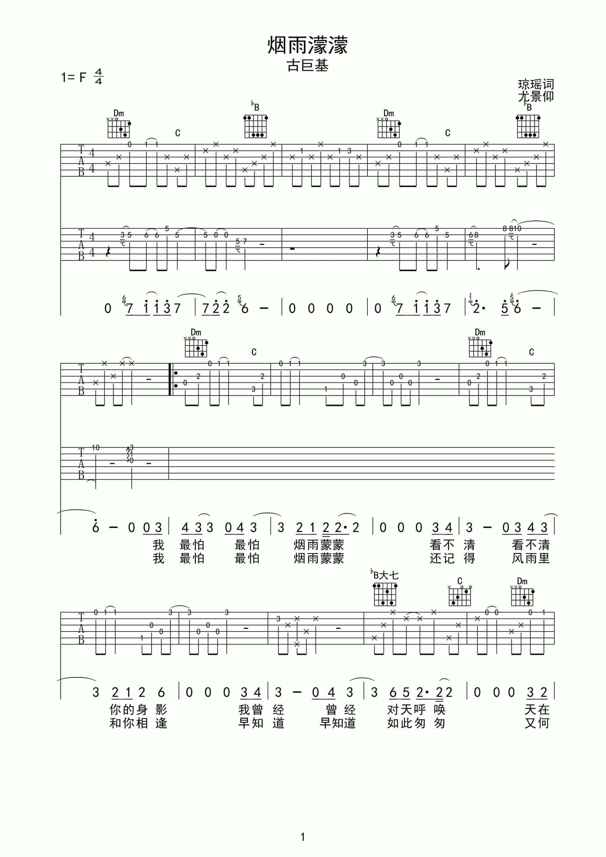 曲谱介绍: 烟雨濛濛吉他谱采用F调指法,由琼瑶词,尤景仰完成。烟雨濛濛是琼瑶电视剧《情深深雨濛濛》片尾及插曲。听兄弟说,还是没想到吉他谱听了耳朵会怀孕,快快学起来,学完去撩妹!