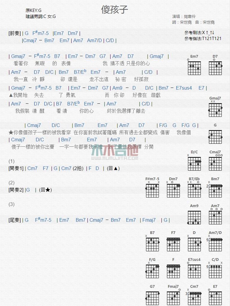 曲谱介绍: 傻孩子《傻孩子_》吉他弹唱谱,共有1张高清图谱,免翻页排版设计。