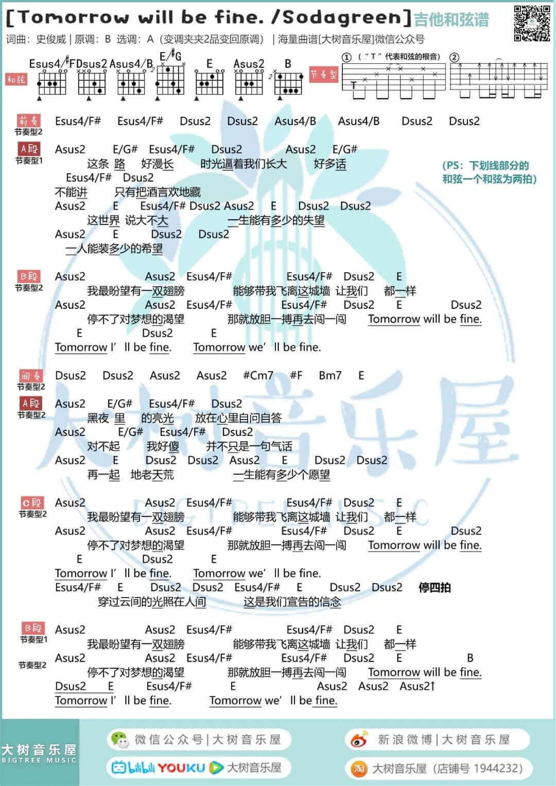 曲谱介绍: Tomorrow will be fine吉他谱采用了A调指法,由大树音乐屋编配完成。Tomorrow will be fine看到这一句话,就感觉阳光瞬间洒满了身上,让我们看到了属于自己的光芒,很多时候,我们会觉得这个世界充满了黑暗,这个世界的路变得好难走,可是,只要我们再坚持一会,也许我们就能够感受到了阳光照进来的感觉,Tomorrow will be fine苏打绿的演唱给我们带来了希望和阳光,让我们无比享受。另外,和这首一样赞的美丽人生吉他谱也非常NICE,大家快去学习吧!