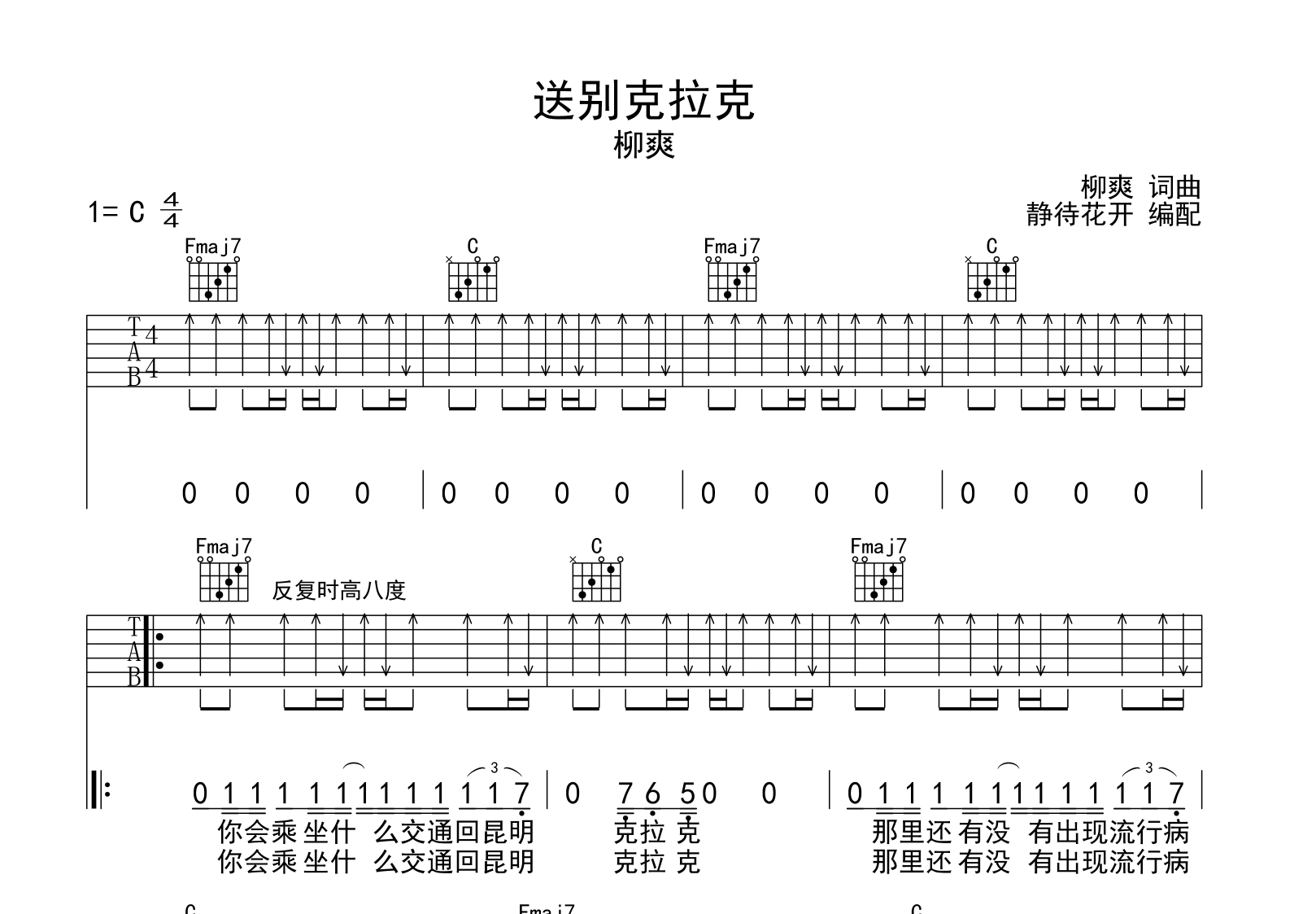 曲谱介绍: 送别克拉克吉他谱,柳爽演唱的一首歌曲,《送别克拉克》吉他弹唱谱,共有三张图片谱,本谱采用C调和弦指法编配,节奏4/4拍,曲速85拍每分钟,弹唱建议不夹变调夹,指法简单,本谱由@静待花开制谱编配。