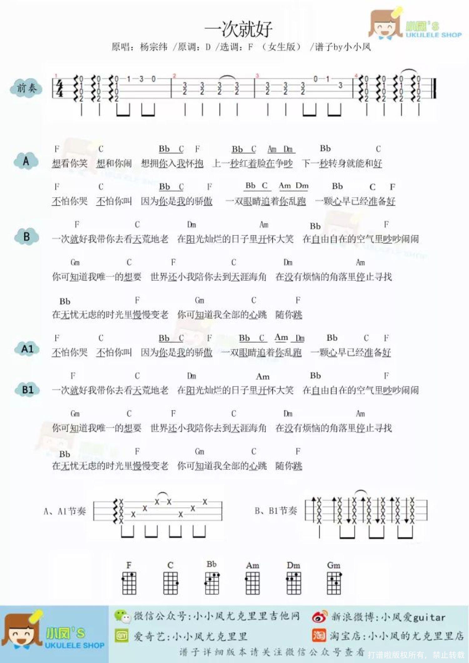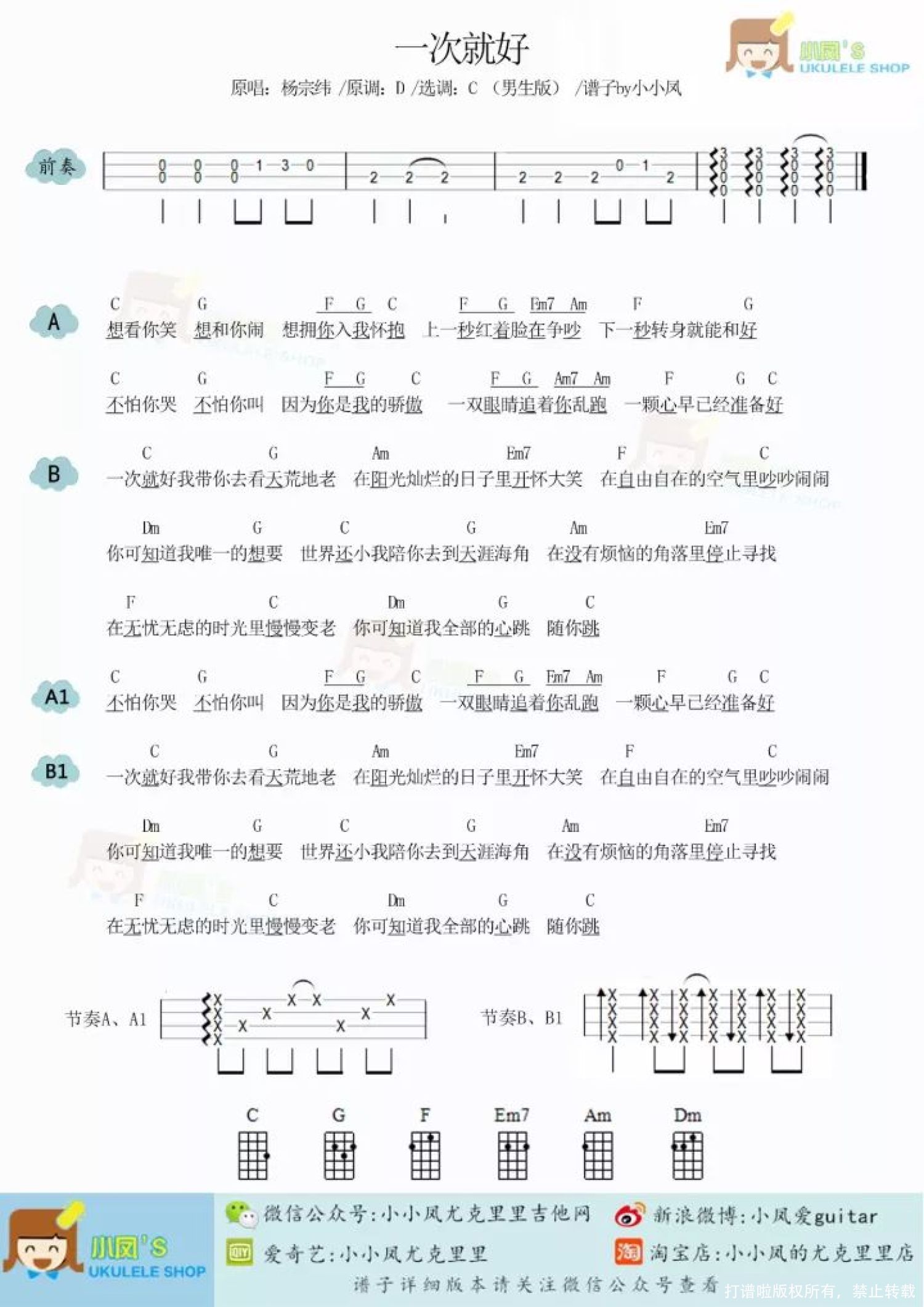 曲谱介绍: 《一次就好》尤克里里谱 1、女生版     2、男生版 在这个世界上 总有一天,会有一个人, 看你写过的所有说说朋友圈微博 读你分享过的所有链接你想要的所有东西 千方百计的找寻你从小到大的所有相片 甚至去你去过的城市 走你走过的足迹 看你喜欢看的书 试过所有你喜欢的美食 就算TA原本并不喜欢 只是想补上 你的人生里 TA不在的那些时光 TA想要的可能很简单 有你在身边 在阳光灿烂的日子里开怀大笑 在自由自在的空气里吵吵闹闹 就足够