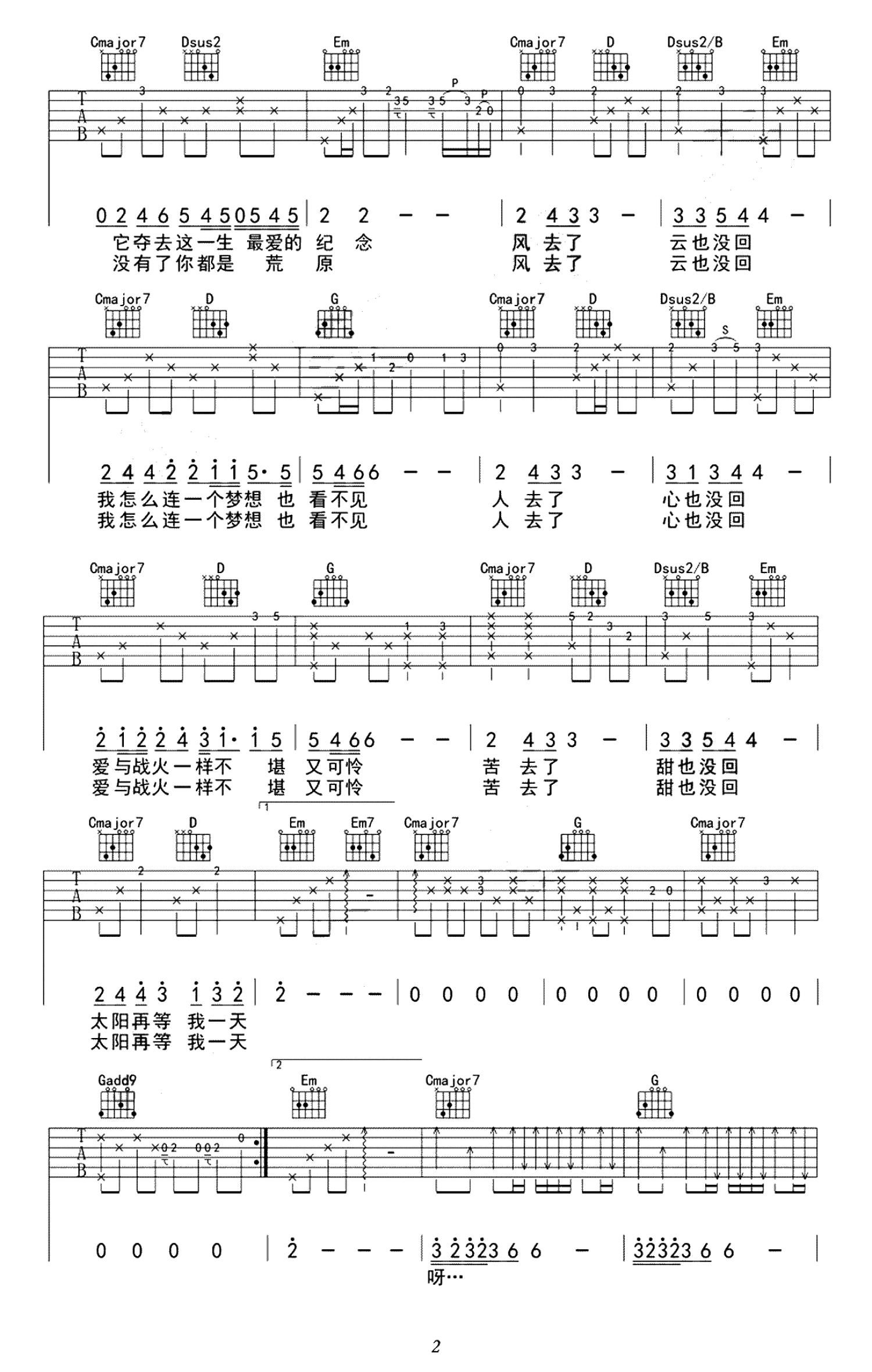 曲谱介绍: 风去云不回吉他谱,吴京《战狼2》推广主题曲,这是一曲男主角的内心独白,一个铁血的男人也有如此柔情的一面,吴京温柔演绎冷锋与龙小云的战地恋曲,深情眷恋意境清澈而悠远。