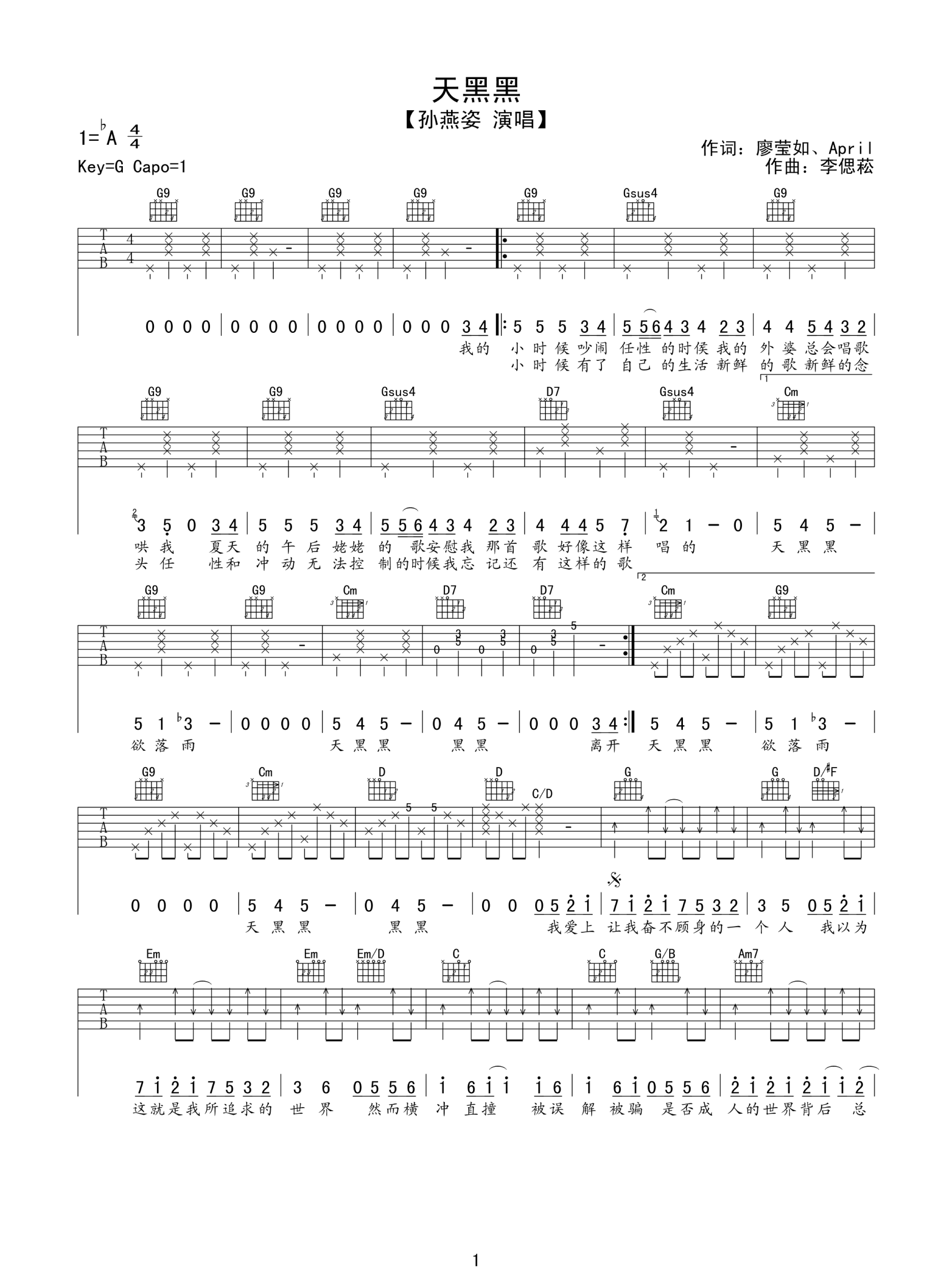 天黑黑吉他谱 - 孙燕姿 - A调吉他弹唱谱