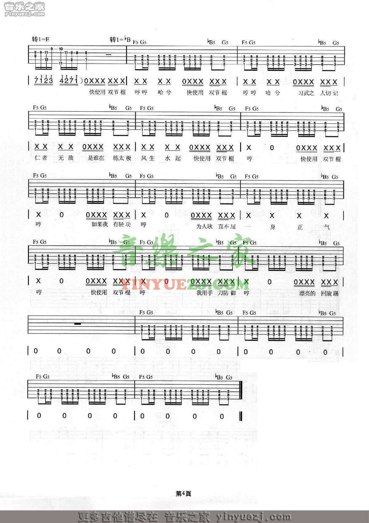 曲谱介绍: 双节棍吉他谱采用了bB调指法,由音乐之家编配完成。这是一首大家耳熟能详的音乐作品,受到了很多人的追捧和喜爱。周杰伦的这首《双截棍》是一首十分搞怪有趣的歌曲,与以往不同这是一首典型描述中国武术的歌曲,编曲上是刚柔并济,并且加上了摇滚和超快版Rap曲,使得这首中国风音乐打破了传统手法,这首歌曲已经是每一个人很熟悉的一首音乐作品了,特别是那一句快使用双截棍哼哼哈兮。另外,这首愿望吉他谱也超级好听,小伙伴们有福啦,还不去练起来?