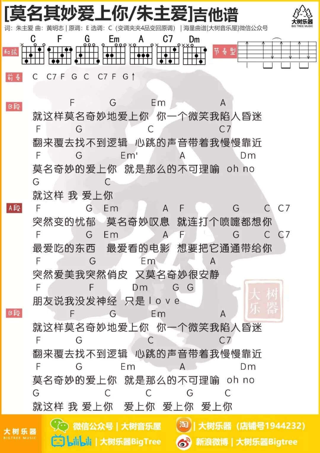 曲谱介绍: 莫名其妙爱上你吉他谱采用了C调指法,由大树音乐屋编配完成。《莫名其妙爱上你》这首歌曲是由黄明志作词,作曲,朱主爱演唱的一首歌曲,收录于专辑《我来自四叶草》中。号外:在这里小编要推荐这首亲亲我的宝贝吉他谱,它也很好听,大家赶快学习起来啦,不要犹豫!