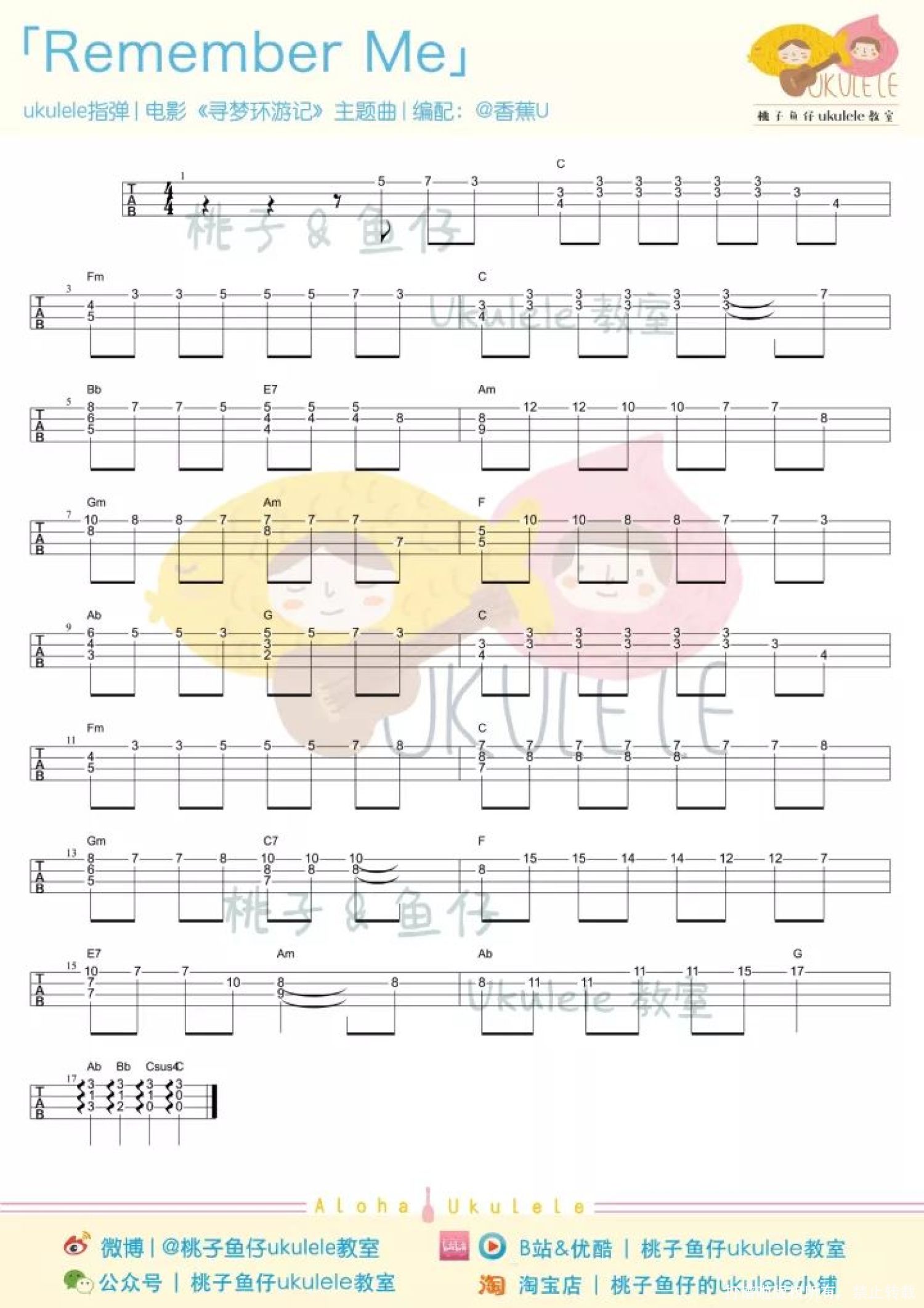 曲谱介绍: ● 「Remenber Me」是皮克斯工作室电影《寻梦环游记》的主题曲,这首歌其实是墨西哥的经典歌曲,被打造了经典曲目《冰雪奇缘》「Let it go」的音乐人洛佩兹夫妇重新打造; ● 全片最主要的一首歌曲,整部电影也是随时出现~ 最后当小男孩“米格”唱给自己的曾祖母时也是全片最具泪点的地方。 英文版是由本杰明布拉特和男主的小配音演员安东尼所演唱,而中文版则是由大热的新人毛不易演唱。   - 几 个 版 本 -   1.赢片中小男孩米格和曾祖母Coco合唱的Lullaby摇篮曲版本,全片最具泪点的地方。   2.美国R&B歌手Miguel和墨西哥美声歌姬Natalia对唱的英语+西班牙语双语版;   3.中文版【请记住我】由毛不易献唱   尤克里里指弹 尤克里里指弹cover (合奏)   指弹教学   指弹谱   弹唱谱 1、「Remember Me」   2、请记住我 - 毛不易(中文版)