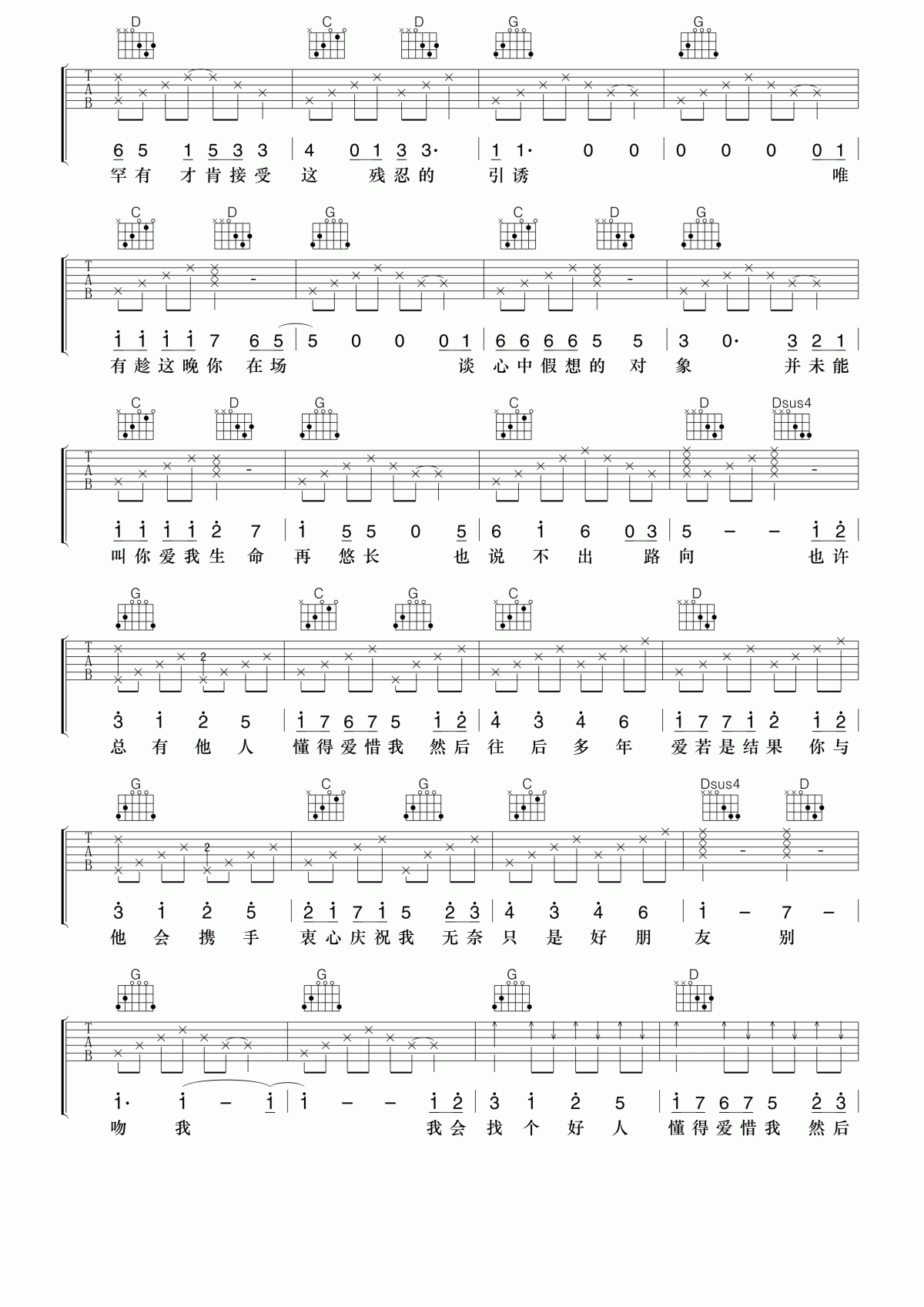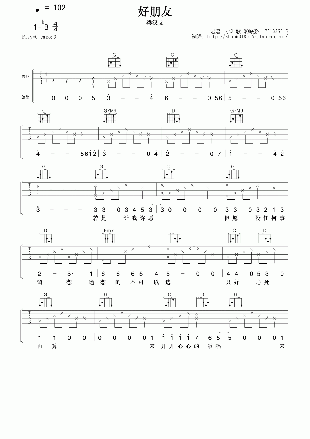 曲谱介绍: 梁汉文《梁汉文好朋友》吉他弹唱谱,共有4张高清图谱。