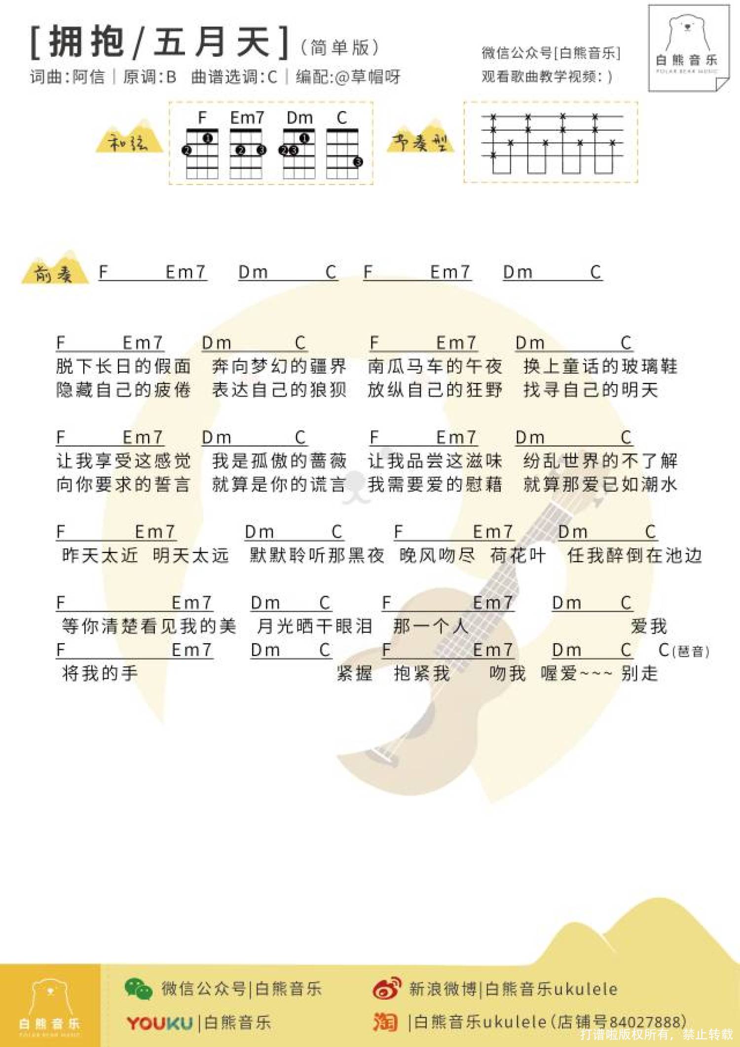 曲谱介绍: 简单版《拥抱》弹唱+指弹谱赶快学起来吧! Ukulele简单弹唱教学         简单弹唱谱   简单指弹谱
