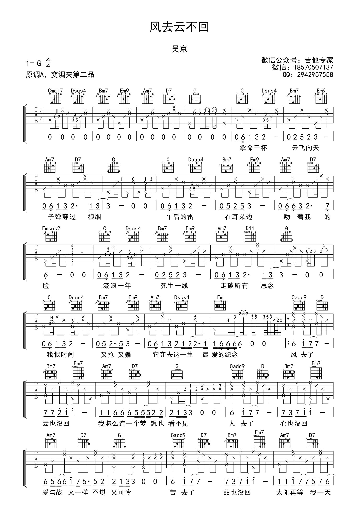 • 风去云不回吉他谱 - 吴京 - G调吉他弹唱谱第1张