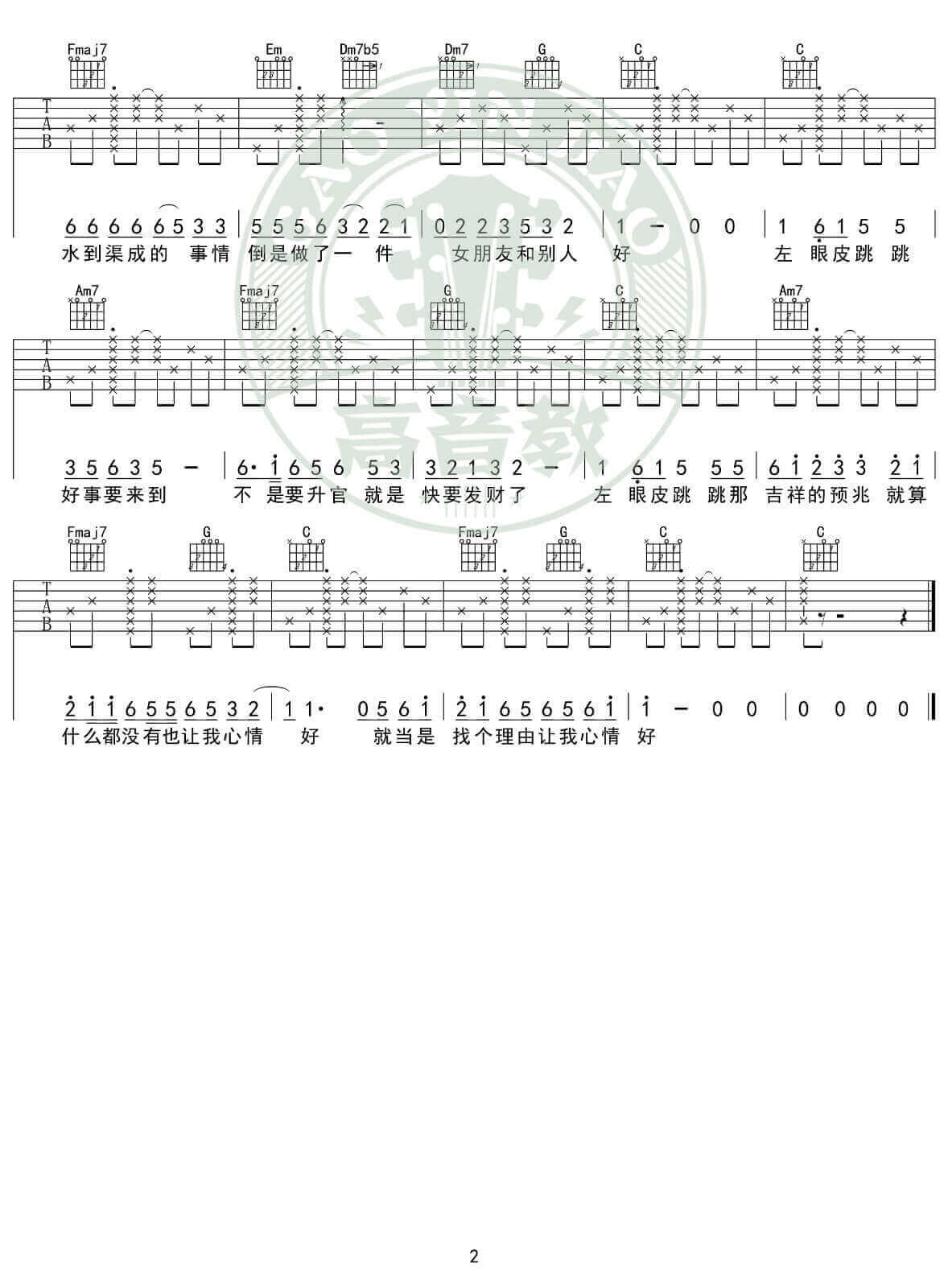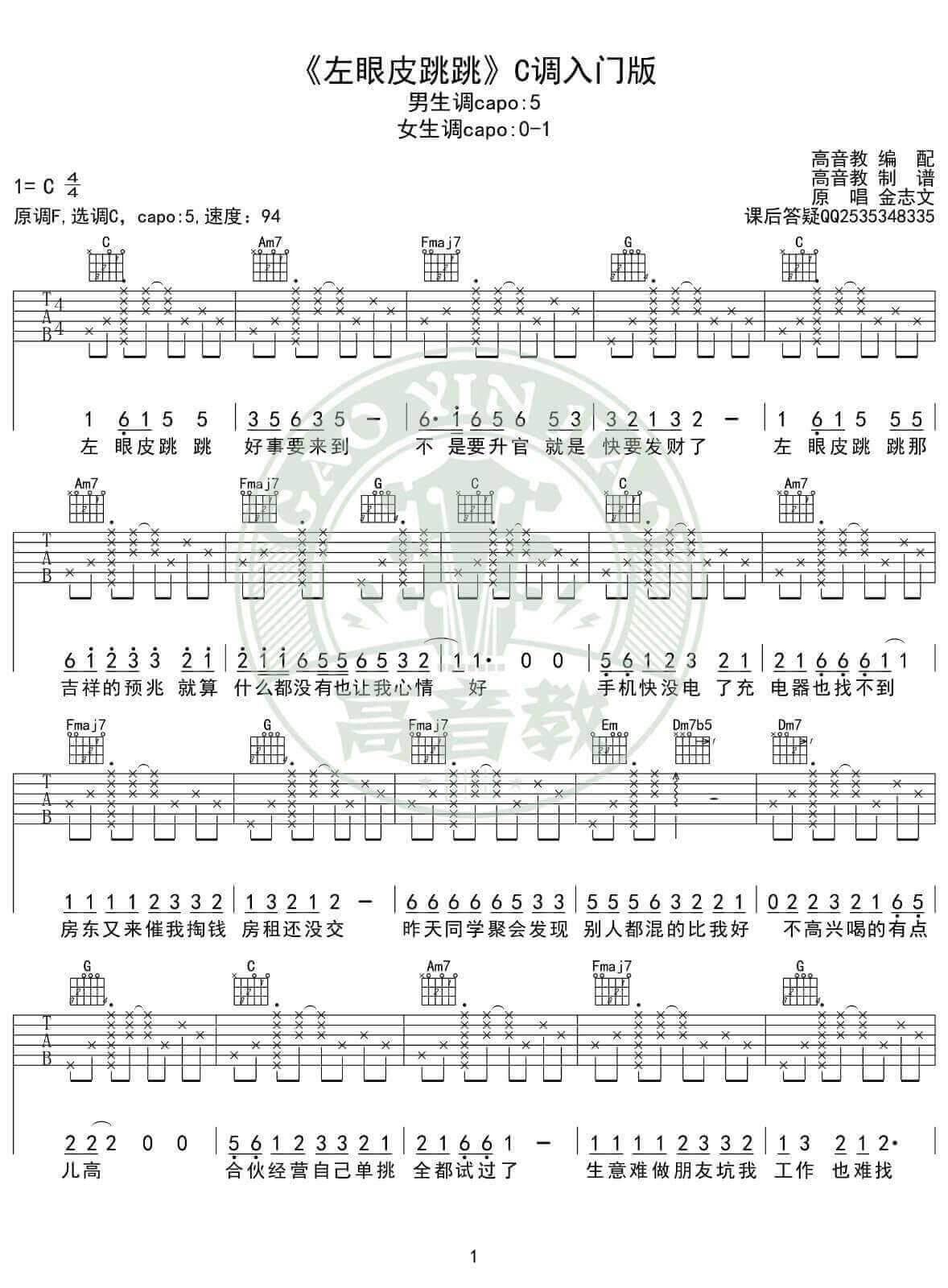曲谱介绍: 左眼皮跳跳吉他谱采用了C调指法,由高音教编配完成。重要提示:别让一切都无法挽回吉他谱更新啦,学完这首后,顺便把下首学了吧。