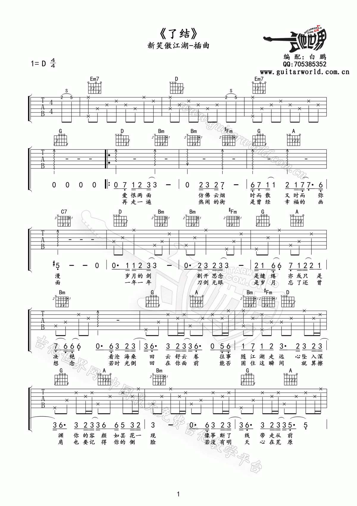 曲谱介绍: 董贞《董贞了结》吉他弹唱谱,采用D调指法编配,共有2张高清图谱,免翻页排版设计。